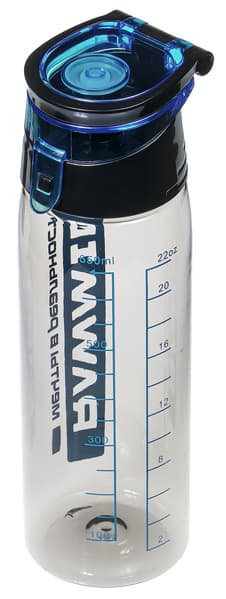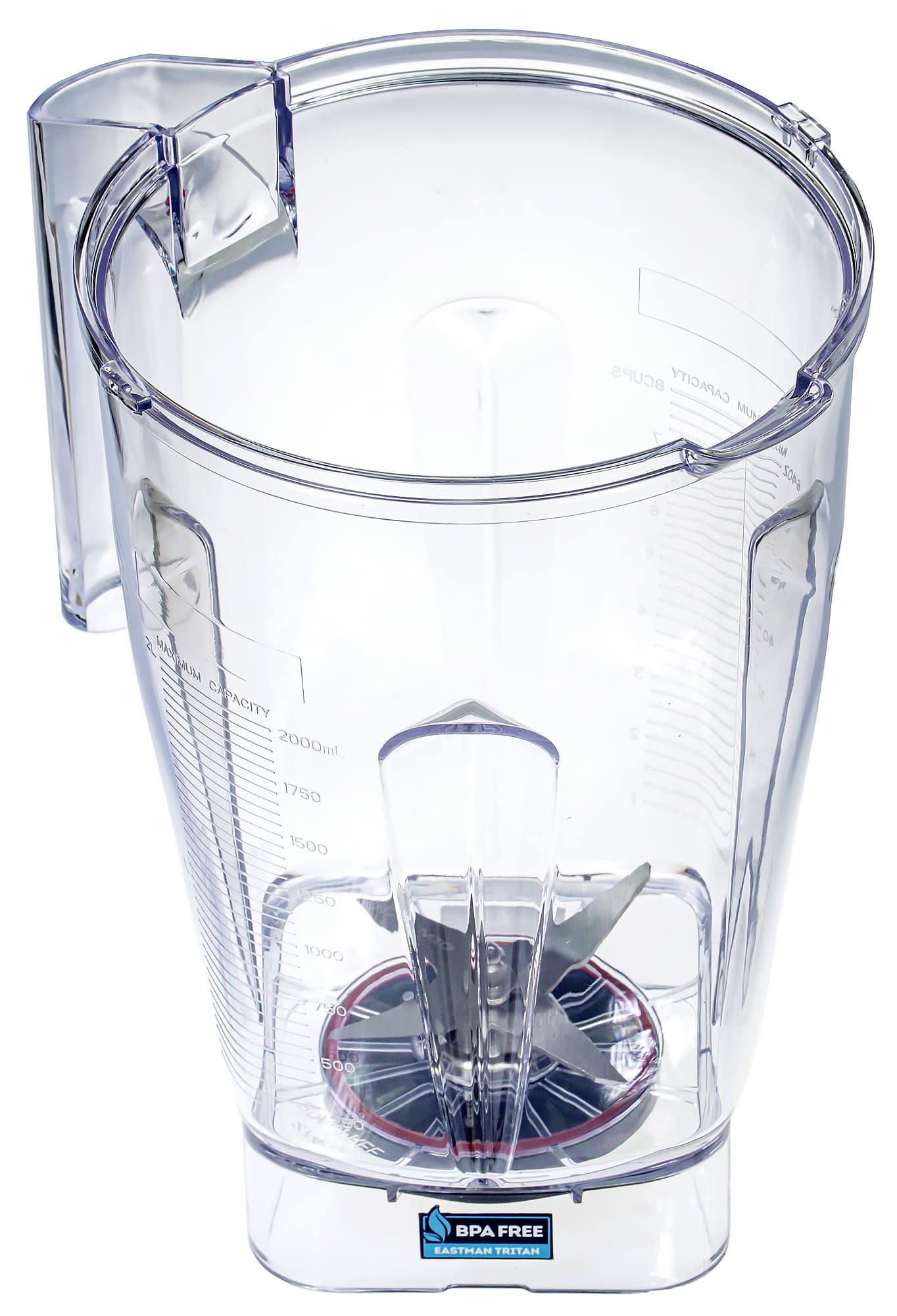 Двухлитровый кувшин выполнен из прозрачного легкого пластика. На него нанесены риски: миллилитры (шаг — 50 мл на одной шкале и 1 л — на другой), унции (шаг — 2 унции) и «чашки». На ручке у него красная точка — это ориентир, чтобы вы правильно установили на чашу крышку: на крышках есть выступы с такими же точками.