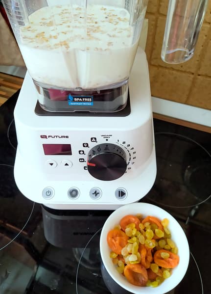 В составе этого смузи — молоко, овсянка, курага, изюм и мед. Инструкция требует непременно использовать толкатель при измельчении размоченных сухофруктов, так что выбираем соответствующую крышку. Работать будем в ручном режиме.