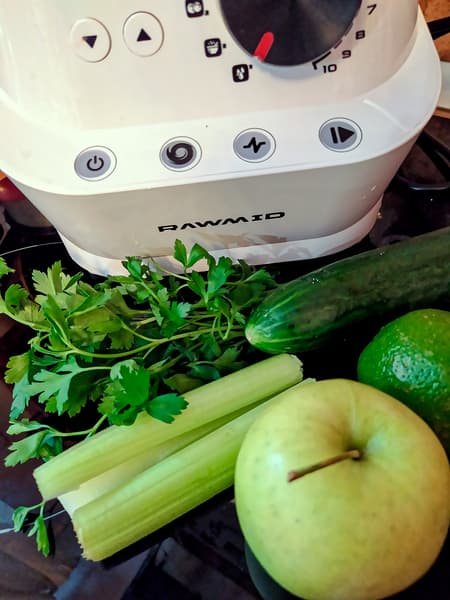 Rawmid обещает, что при измельчении под вакуумом не только сохраняются антиоксиданты, но и цвет получаемого продукта намного ярче, чем после измельчения в воздушной среде. Мы проверим это на коктейле, который часто делаем дома с помощью обычного погружного блендера. Нам понадобится яблоко, огурец, стебель сельдерея, петрушка, немного шпината и сок лайма.