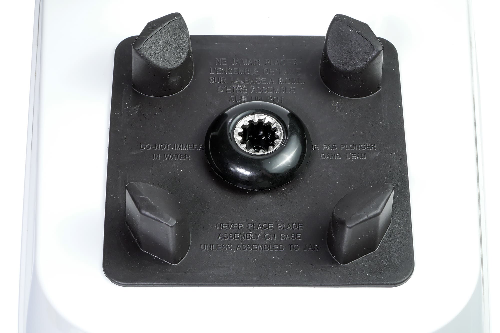Сцепка нож-вал — металлическая. Впрочем, было бы странно, если бы в профессиональном мощном блендере она оказалась бы пластиковой. Чаша должна держаться на корпусе с помощью четырех выступов. Здесь же видим предупреждения: корпус нельзя погружать в воду, а ножи нельзя вставлять без кувшина (не совсем понятно, зачем такое может понадобиться).