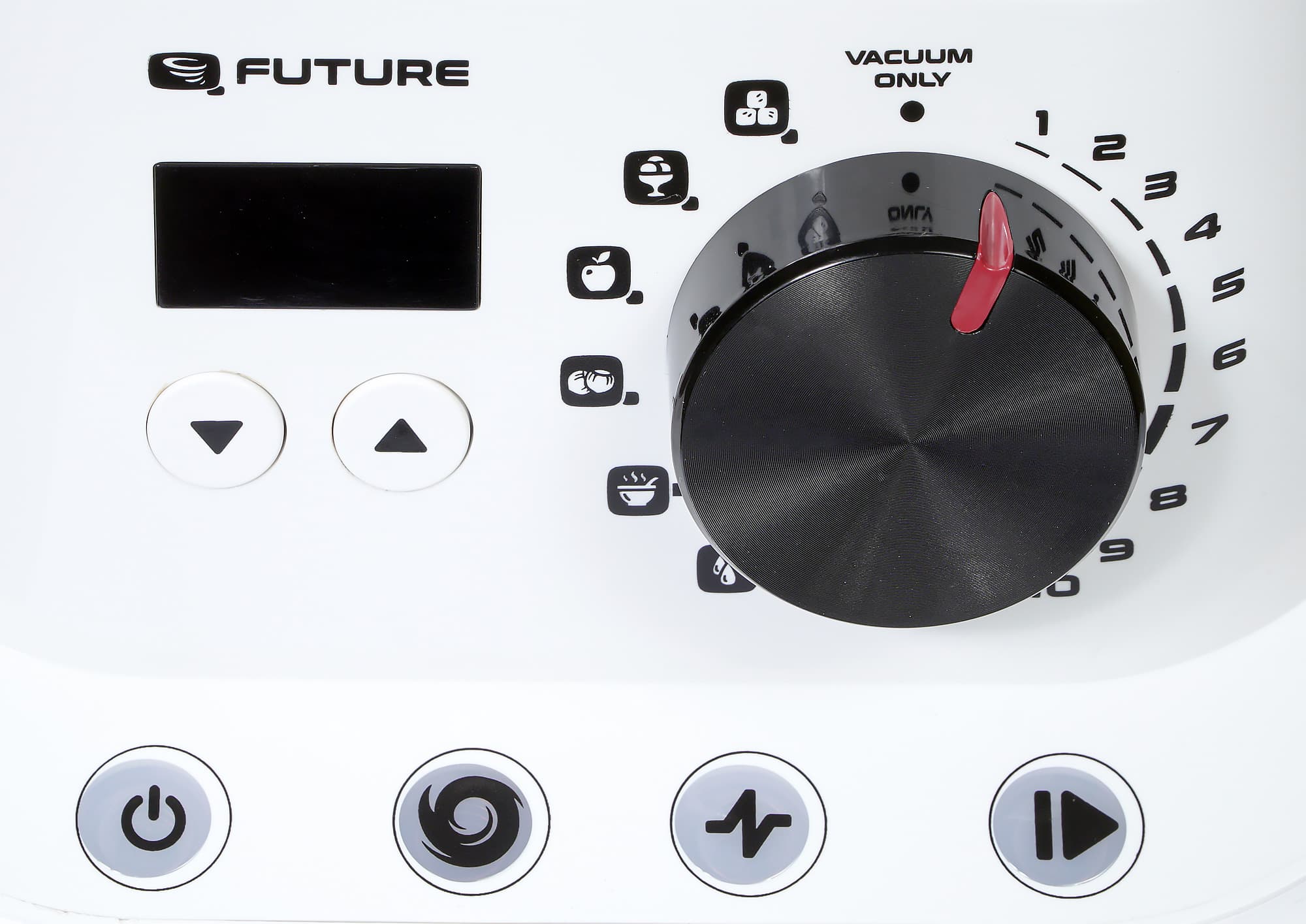 Кнопки питания, включения/выключения вакуумирования, импульсного режима и запуска и остановки мотора при нажатии на них загораются синим и издают звуковой сигнал, остальные элементы управления беззвучные. Скорость и время работы блендера можно менять прямо во время измельчения.