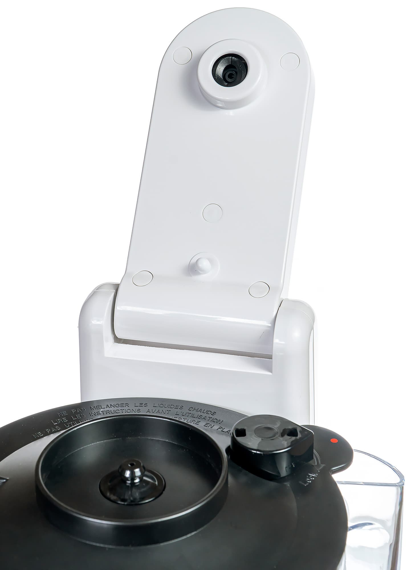 Как мы уже догадались по коробке, RFB-02 — это Гаргантюа в мире блендеров. Самая громоздкая его часть — база. К ней прикреплена стойка с вакуумным рычагом, так что в кухонный шкаф такую конструкцию не спрячешь. Да и сам корпус немаленький: мощный мотор явно требует места. Панель управления занимает всего половину передней грани базы. На правой боковой поверхности находится кнопка включения/выключения питания.