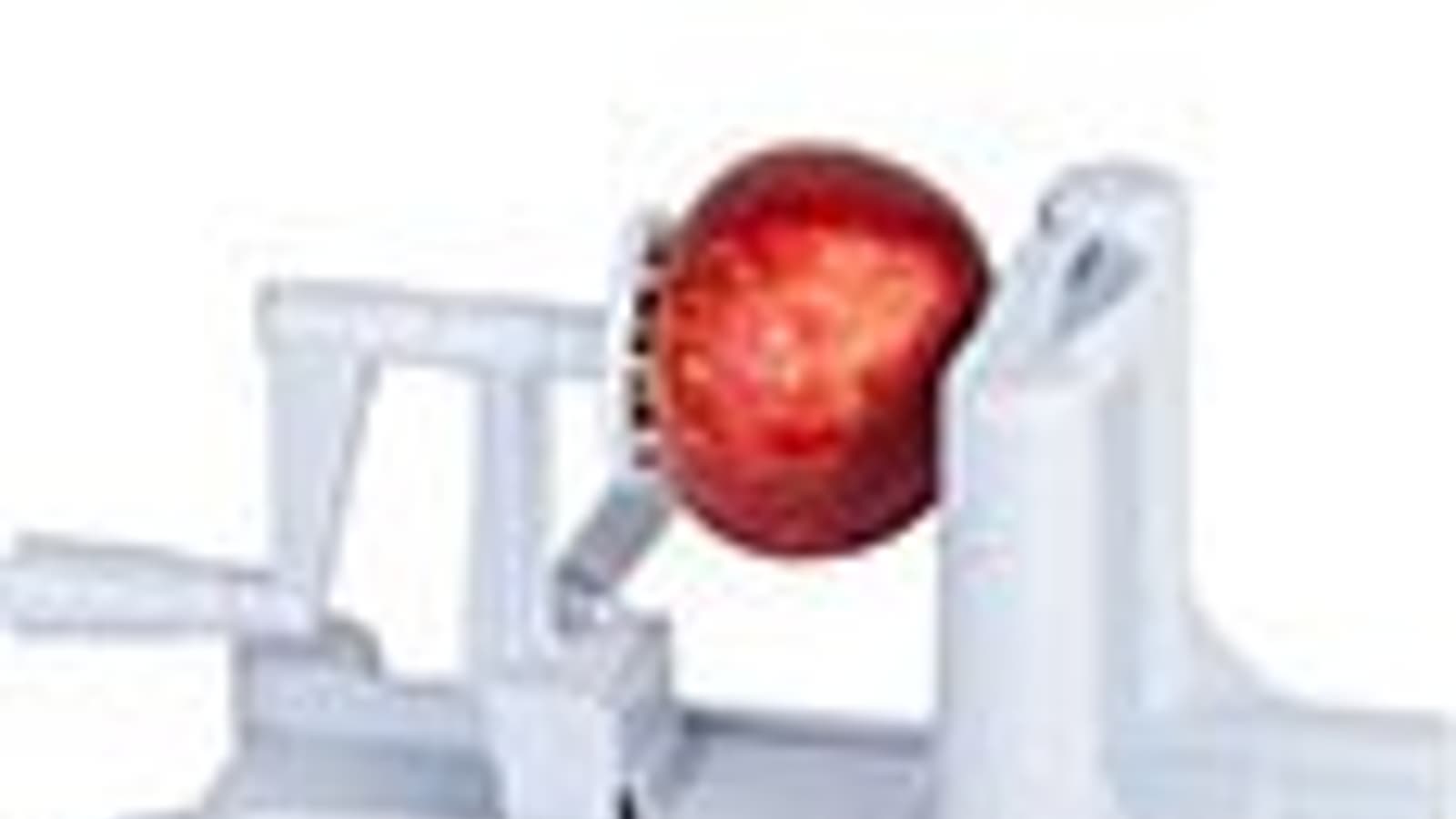 Результат опытов с яблоком нас также не вдохновил. Нарезали мы на пластине со сплошным ножом. Спиральки получались тонкие и рвущиеся при изгибании.
