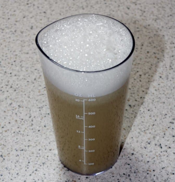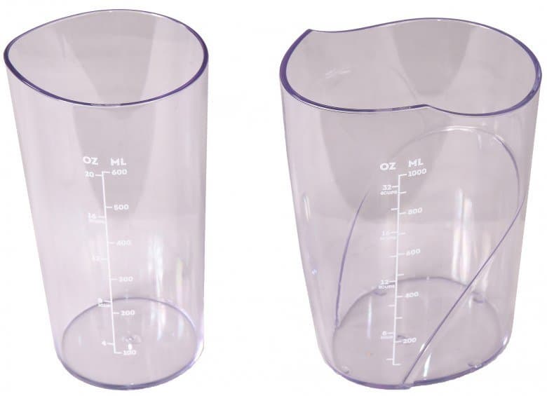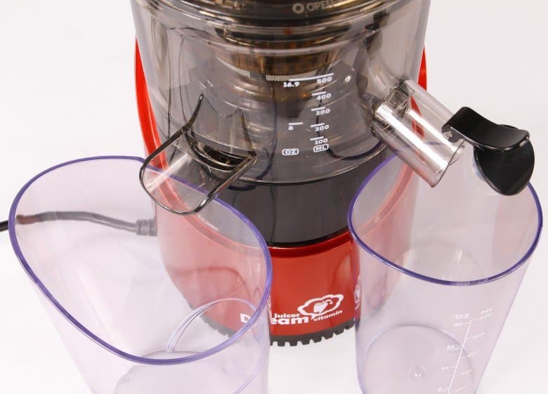 Отжимная корзина сделана из прозрачного пластика и имеет градуировку от 100 до 500 мл с шагом в 100 мл. Также присутствуют отметки на уровне 8 и 16,9 унций (oz). Градуировка присутствует на пластиковом стакане для сока (от 100 до 600 мл с шагом в 100 мл, от 4 до 20 унций с шагом в 4 унции, а также отметки на уровне первой и второй чашки), а также на стакане для жмыха (от 200 до 1000 мл с шагом в 200 мл, от 8 до 32 унций с шагом в 4 унции, а также отметки на уровне каждой полной чашки).