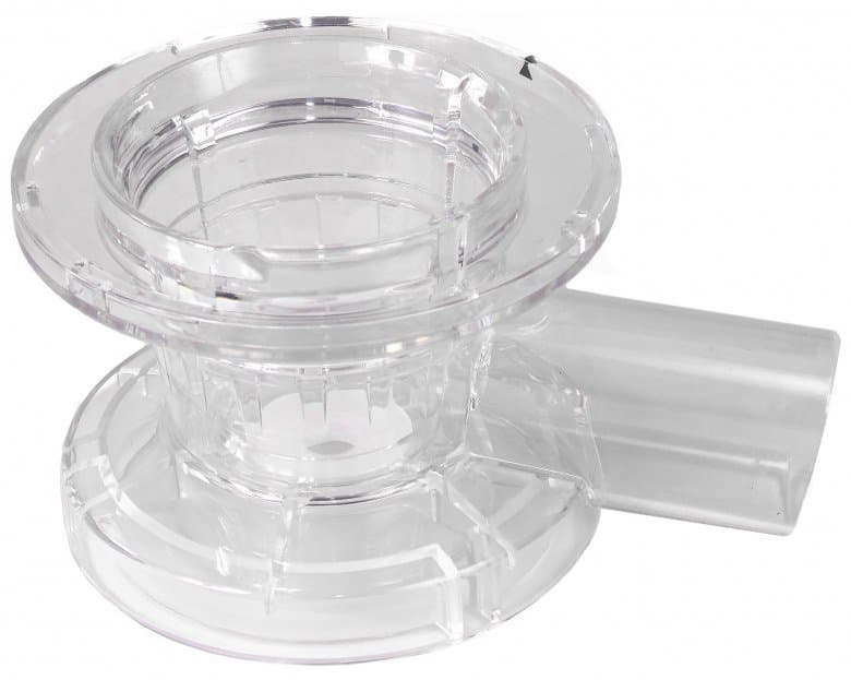 Насадка-терка представляет собой, по сути, дополнительную пластиковую корзину. Вместо шнека в нее устанавливается пластиковая вкладка и один из трех дисков из нержавеющей стали. Сверху корзина точно так же закрывается прозрачной крышкой с отверстием для подачи продуктов. Внутри можно увидеть вращающуюся лопатку, которая сбрасывает измельченные овощи в подставленную емкость.