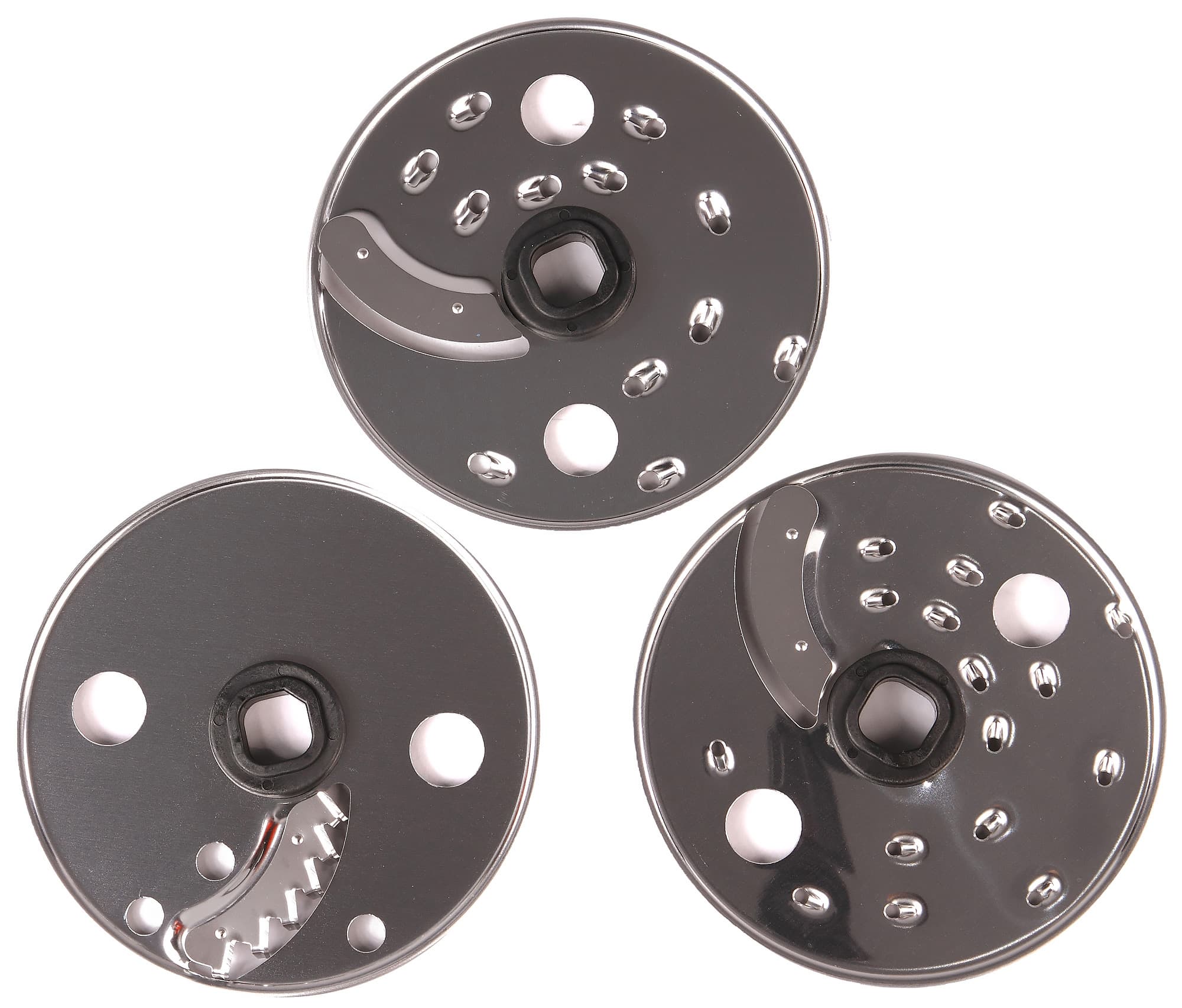 Диски для нарезки имеют специальные отверстия, за которые их удобно брать. Два диска из трех являются двусторонними: с одной стороны у них находится терка, с другой — нож для нарезки.