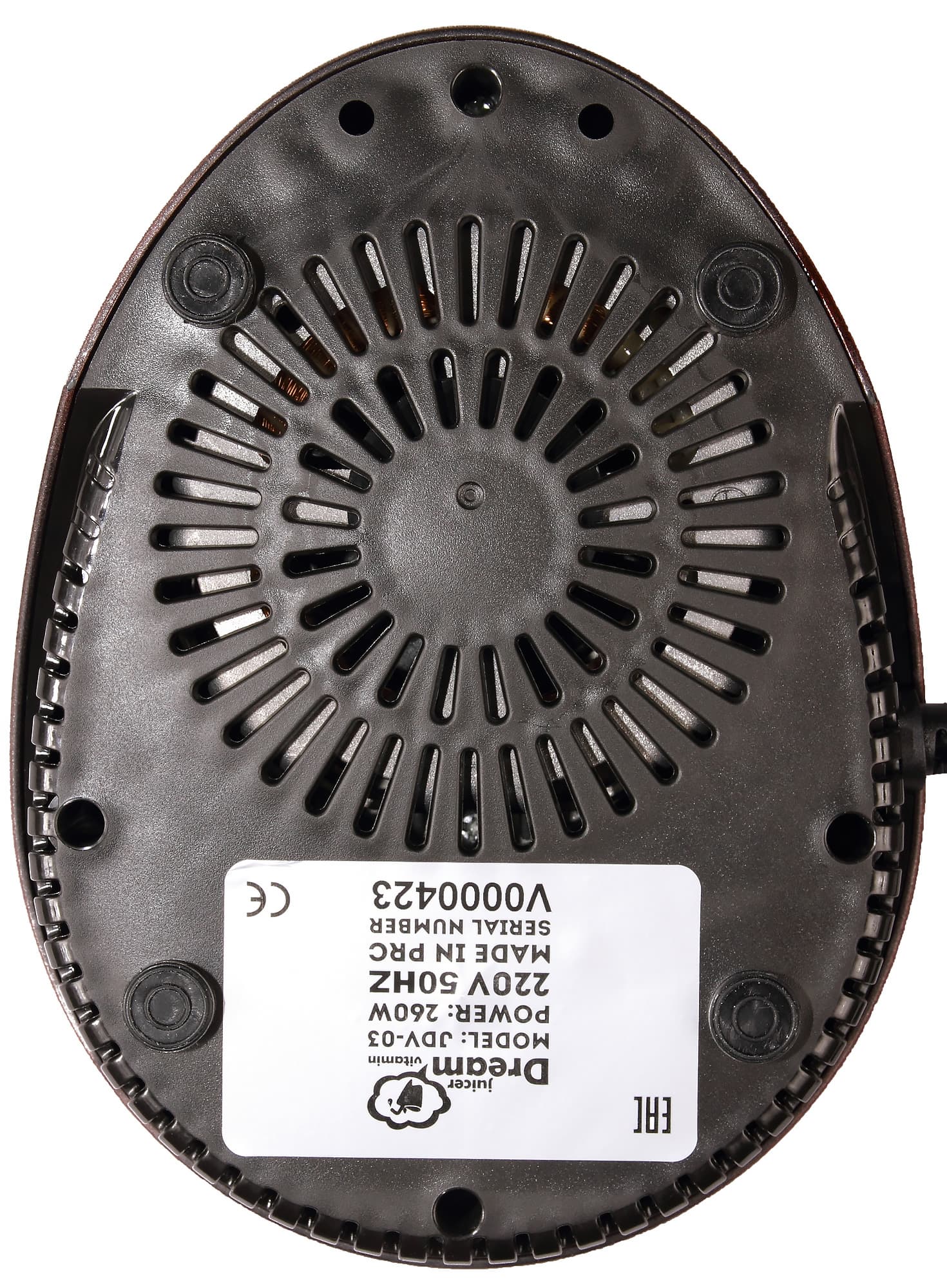Корпус моторного блока соковыжималки сделан из пластика, форма его стандартная. Спереди можно увидеть логотип, сзади — кнопку управления, по бокам и снизу — вентиляционные отверстия. Снизу также можно заметить наклейку с техническими данными и прорезиненные ножки. Шнур питания расположен слева — явно нестандартное решение.