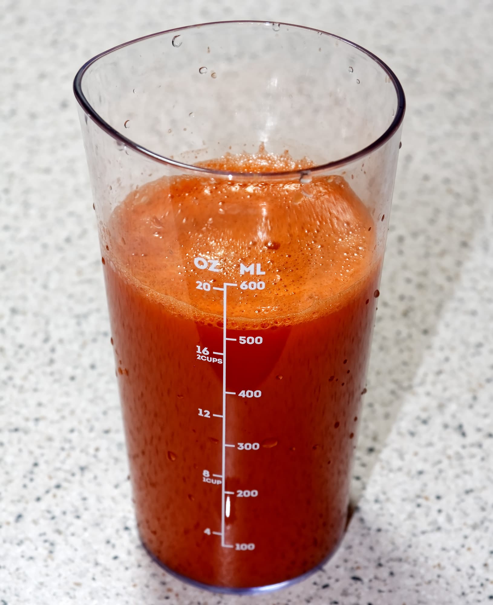 Предварительно нарезанный килограмм моркови был переработан за 3 минуты 11 секунд (показания мощности соковыжималки при этом оказались выше заявленных и доходили до 300 Вт). Вес сока составил 518 г.