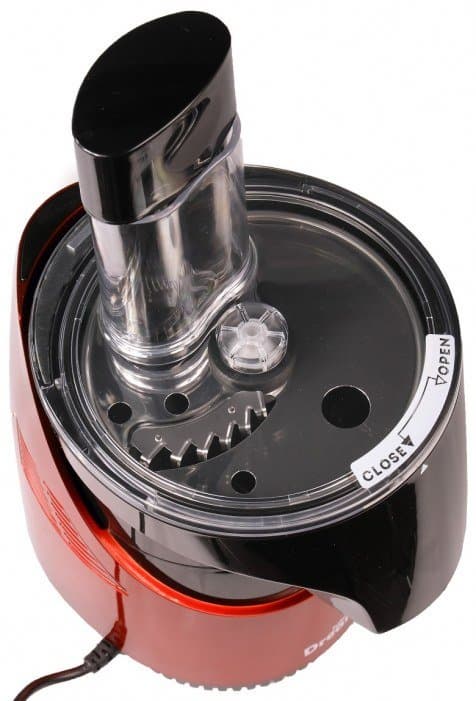 Крышка для отжимной корзины с раструбом для подачи исходного сырья также сделана из прозрачного пластика. Загрузочное отверстие имеет диаметр 7,5 см. С одной стороны это удобно — в него может поместиться целиком даже небольшое яблоко. С другой — увеличивается опасность «заклинить» механизм слишком большим куском твердого овоща (например, моркови).