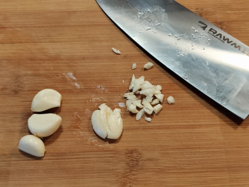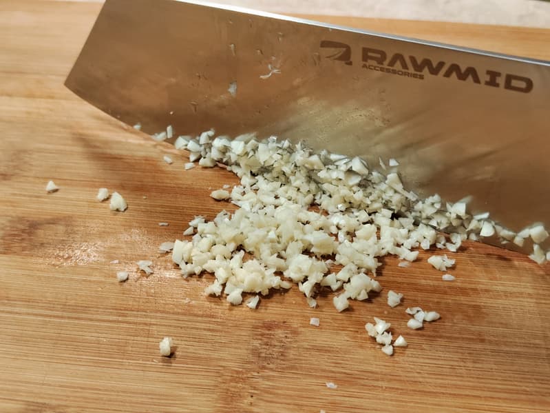 Считается, что с помощью накири легко нарубить зелень и чеснок. Проверим на примере чеснока. Надавив на широкое лезвие, раздавили зубчики чеснока, затем все разом нашинковали. Хоп-хоп-хоп — и чеснок для соуса готов!