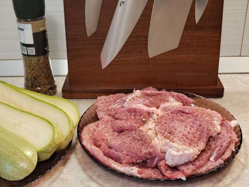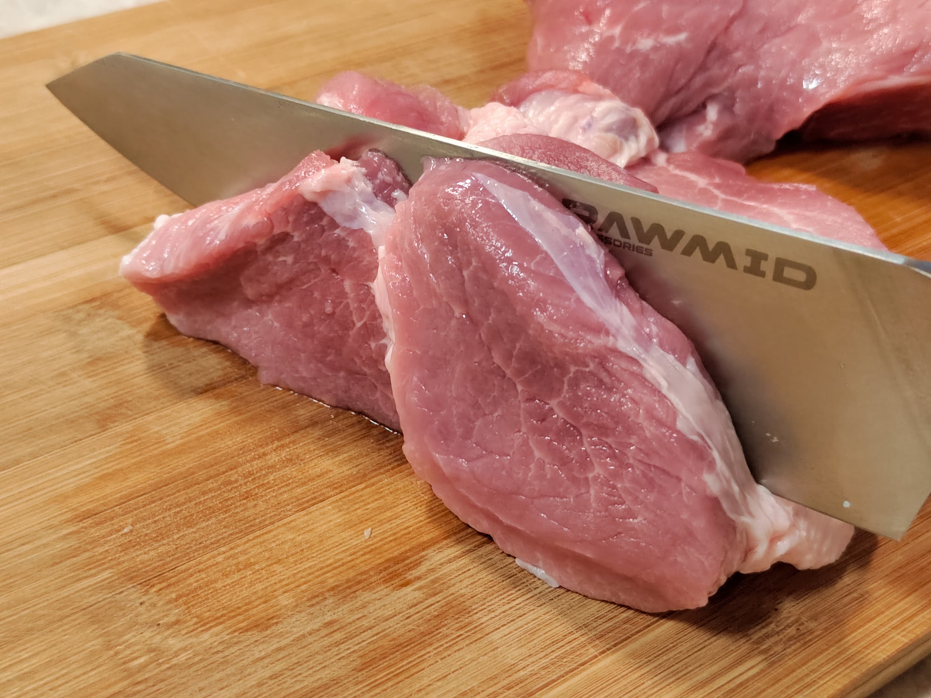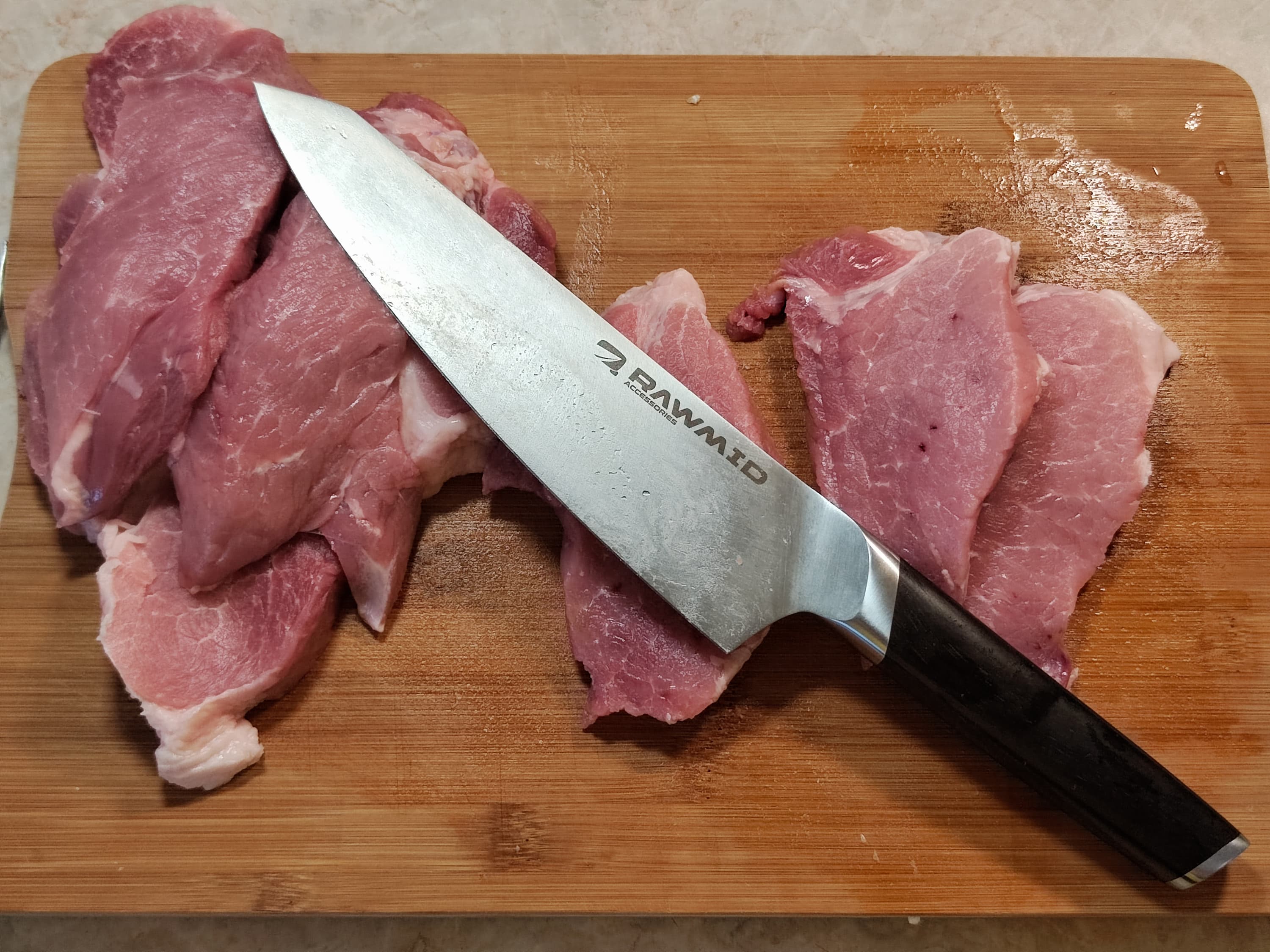 Универсальным ножом можно резать, шинковать и рубить всё, что для этого подходит. Мы пробовали резать мясо и сыр, шинковать лук и морковь. В качестве яркого примера приведем свинину.