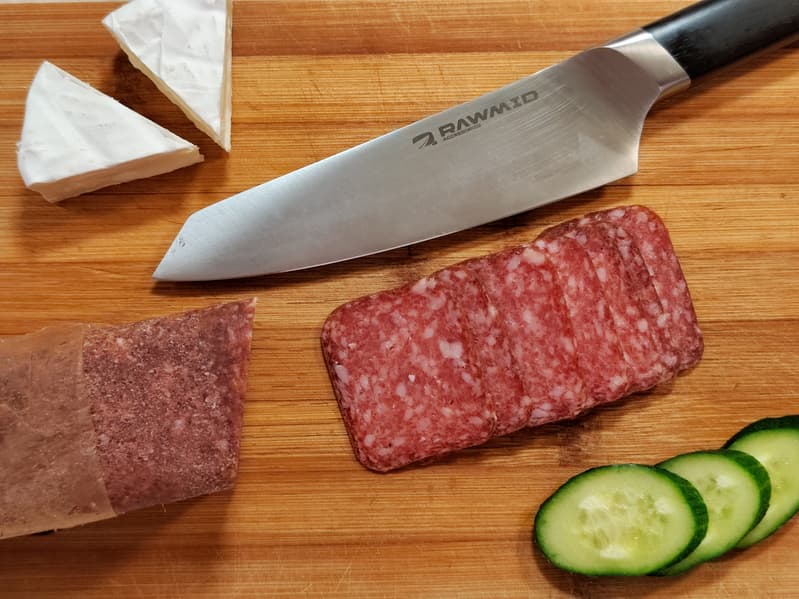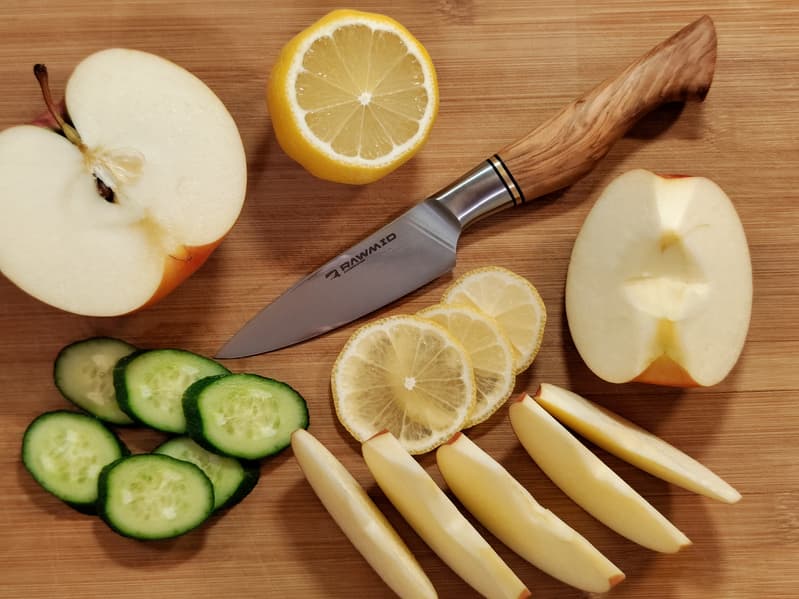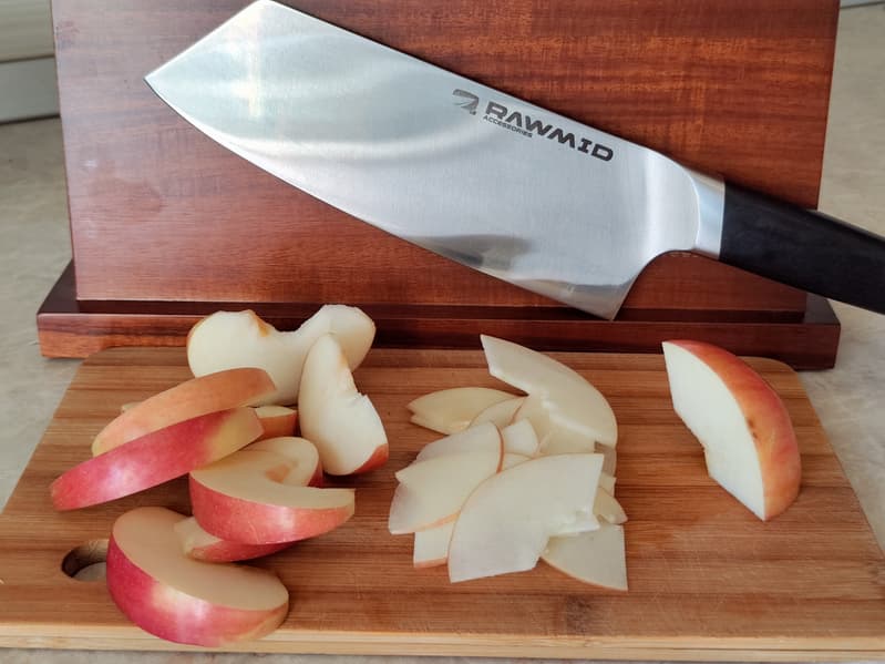 Далее опишем субъективные ощущения при пользовании ножами от Rawmid. Пользовались мы ими неделю, полностью убрав из обихода привычные ножи. Что ж, в целом комплект Modern, дополненный «маленьким» овощным ножом из серии Classic полностью закрыл все потребности по нарезке и шинковке овощей, фруктов, сыра, колбас, хлеба и хлебобулочных изделий, выпечки, мяса, чистке и разделке овощей и фруктов, птицы и мяса.