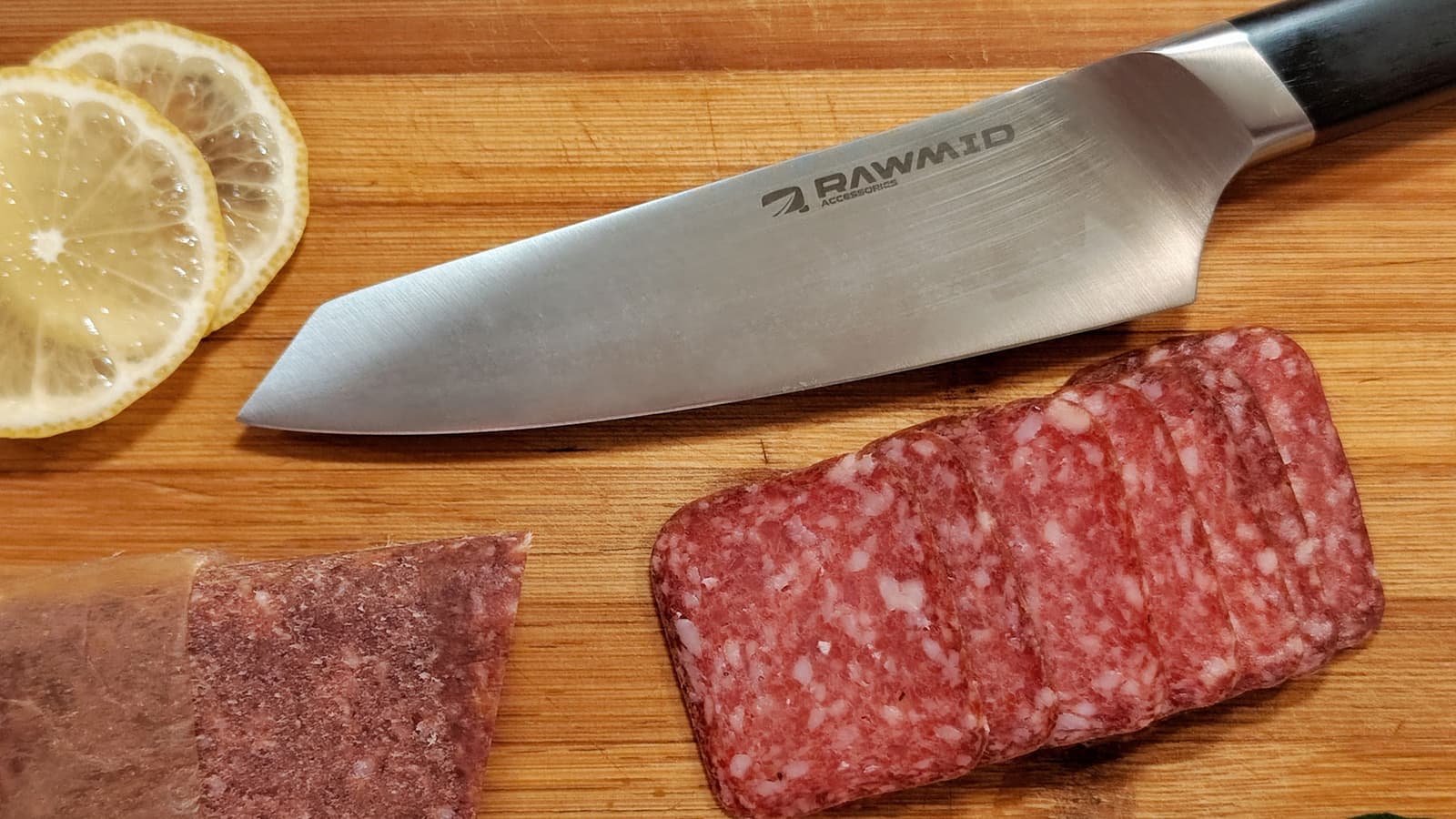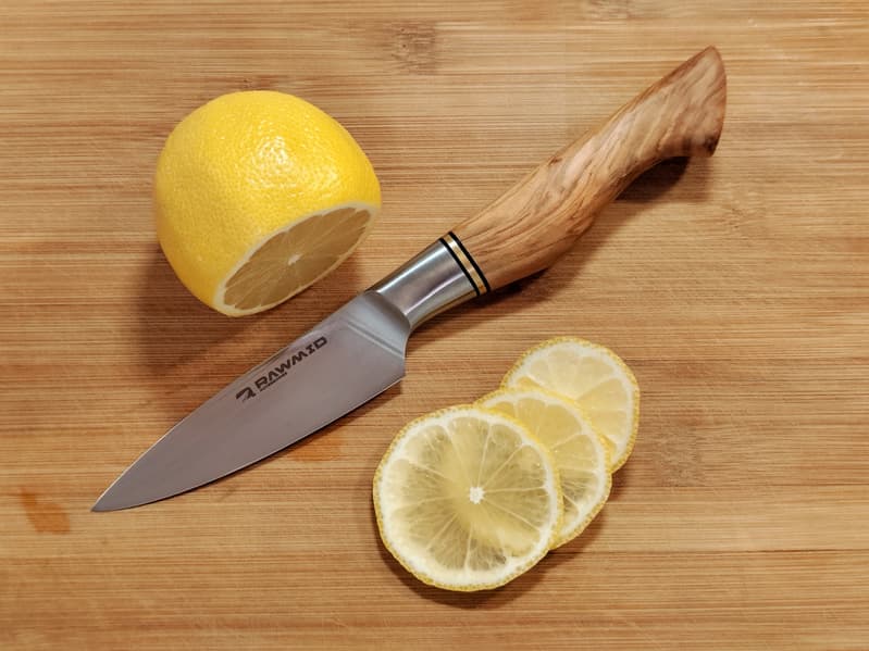 Ножи серии Rawmid Modern RMK-21, RMK-20, RMK-13 и Rawmid Classic RCK-09 выполнены из высококачественной стали, устойчивой к коррозии и легко затачивающейся. Изделия правильно сбалансированы, что вкупе с небольшим весом, приятной на ощупь и удобной по форме ручкой приводит к легкости и эффективности эксплуатации. Есть такое шаблонное выражение: «нож лежит в ладони как влитой». Именно это мы и почувствовали при взаимодействии с ножами Rawmid. Если бы не тесты и необходимость быть сосредоточенными на ощущениях и результатах, мы бы вообще не обращали внимания на нож, которым сейчас что-то нарезаем — не это ли наилучшее свидетельство того, что инструмент чрезвычайно удобен?