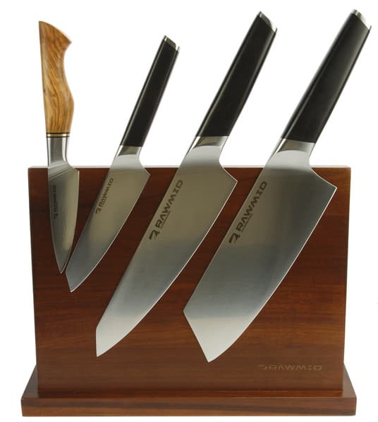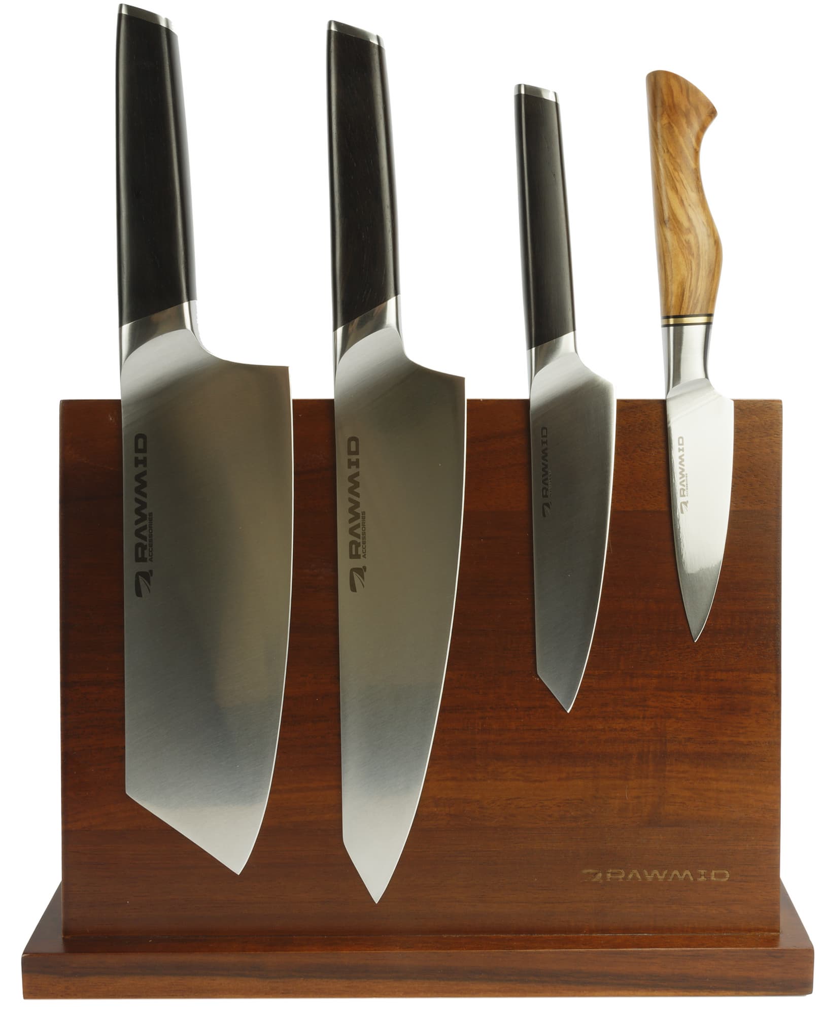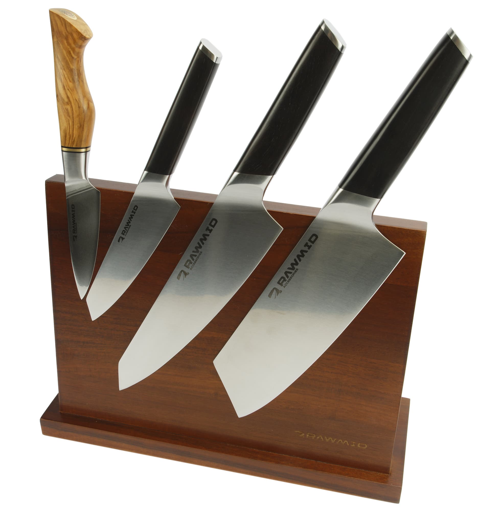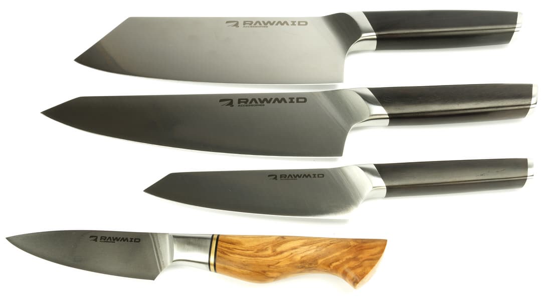К нам на обзор попали три изделия Rawmid из серии Modern и одно — Classic, а также подставка для хранения, подходящая ко всем коллекциям ножей Rawmid. Цель тестирования — оценить удобство использования ножей и наши впечатления от работы с ними.