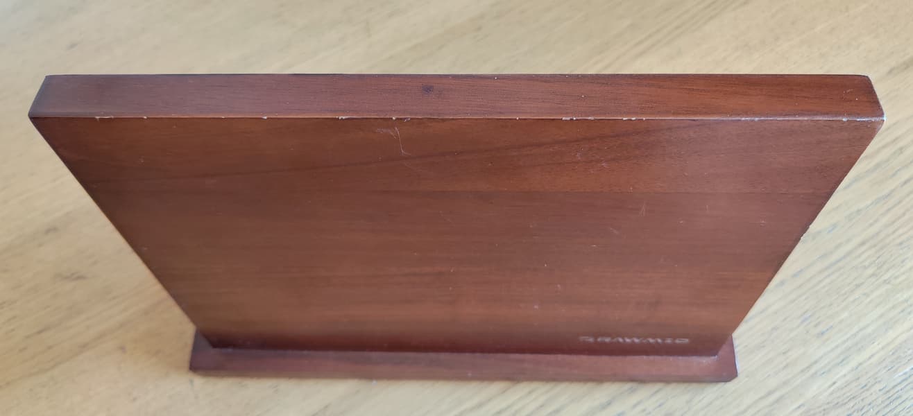 Подставка для ножей пришла в простой коробке, сделанной из неокрашенного картона. Единственным опознавательным знаком на ней служит наклейка с краткой информацией о помещенном внутри изделии — магнитной подставке для ножей RKH-01. Сама подставка была уложена в пупырчатую пленку, которая защищает древесину от повреждений во время логистических операций.