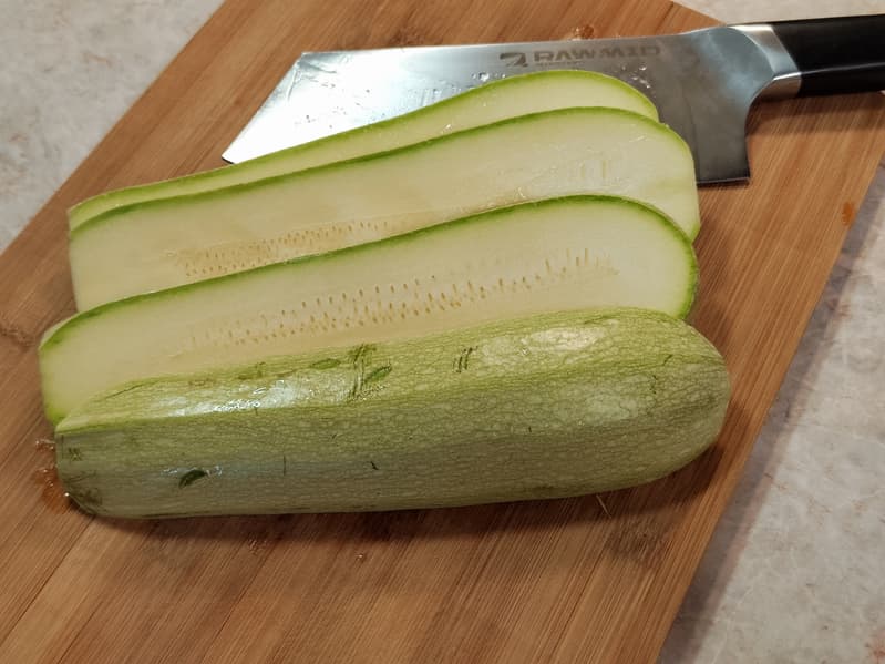 Кабачок можно было бы нарезать и длинным универсальным ножом, но раз уж у нас в наличии накири, воспользуемся им — не одну же зелень им рубить. Разрезали кабачок вдоль пополам, потом каждую из половинок разрезали еще раз. Быстро, удобно, легко. Ручка комфортна, сильно надавливать не нужно — прицелился и режь.