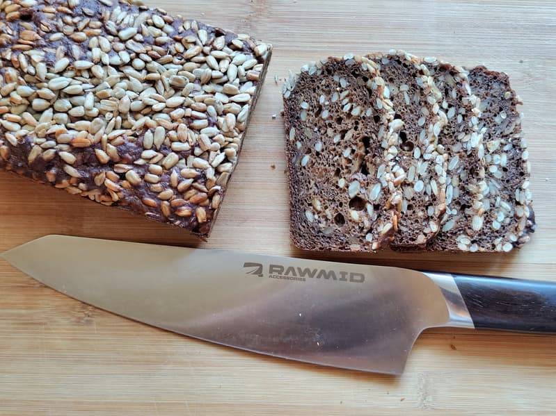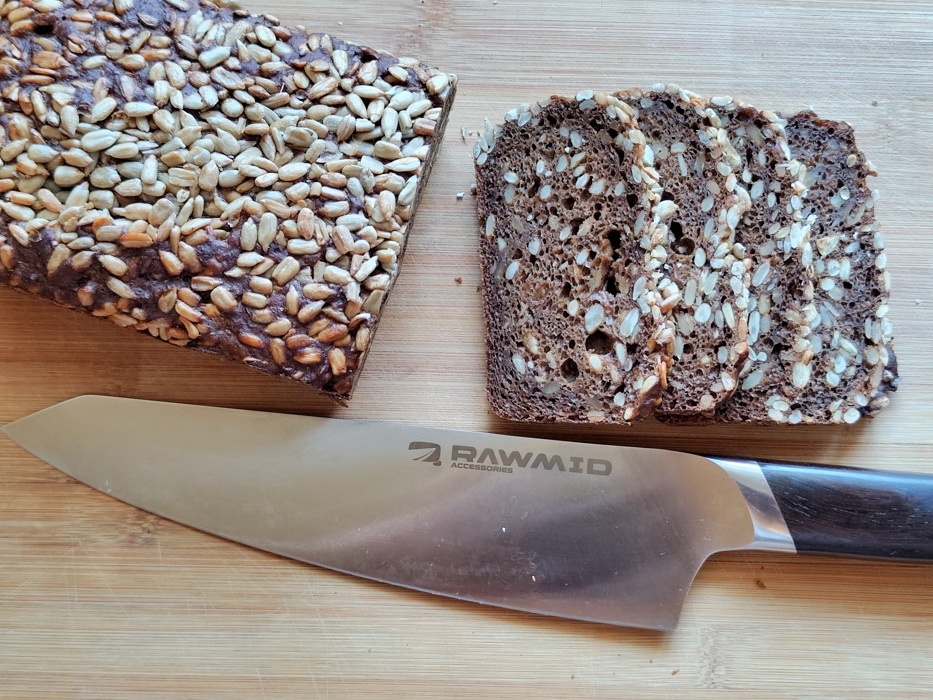 Никакого замятия или деформации буханки, никаких крошек вокруг: нож входил легко, разрезая и семечки, и корочку, и мякиш хлеба одинаково гладко.