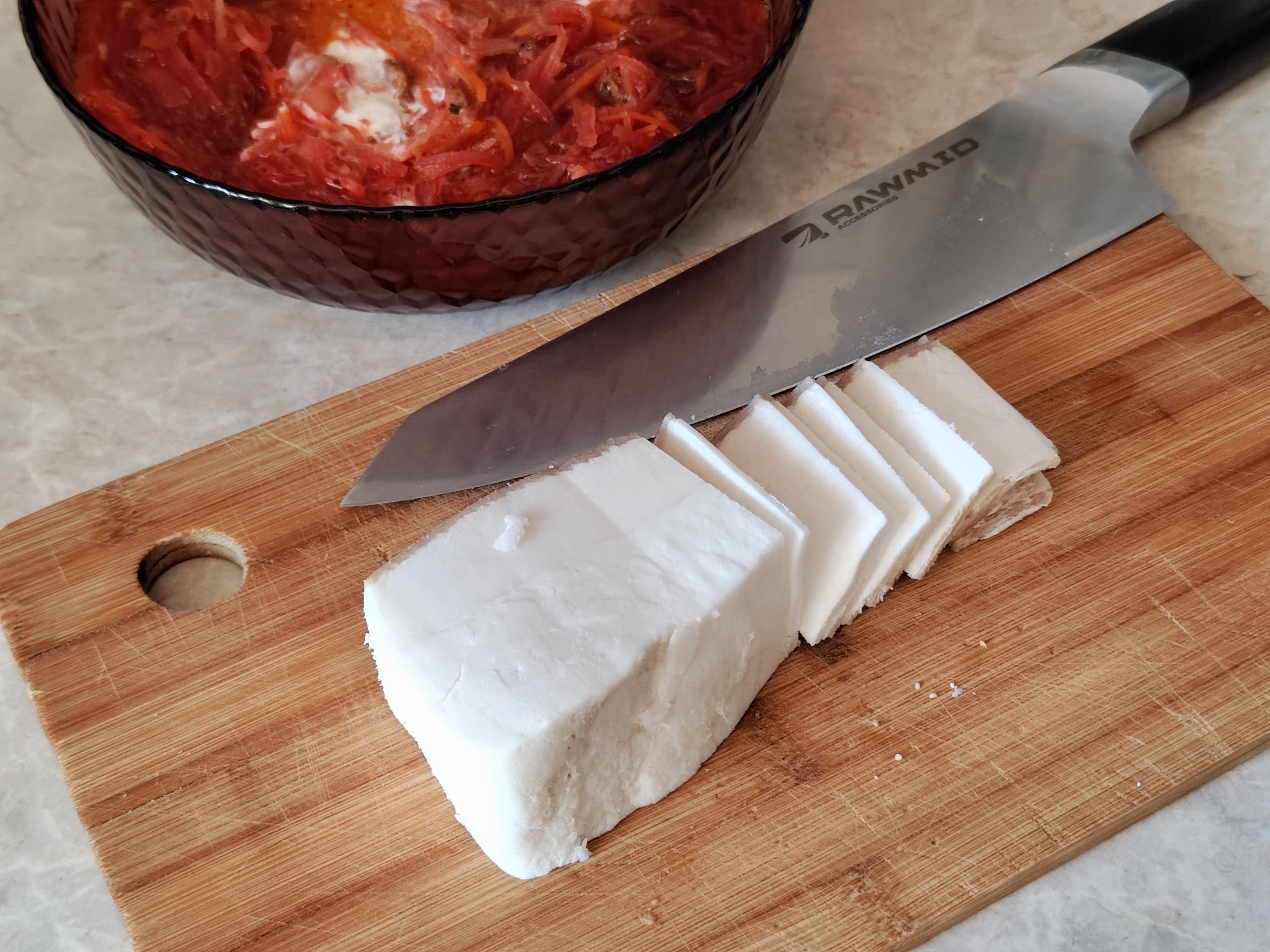С помощью самого маленького в серии ножа мы нарезали выпечку, свежие и вареные овощи, сыр и колбасу. Например, мягкий сыр был разрезан на 8 кусочков без повреждений и «грязи» — мы ни разу не протерли и не ополоснули лезвие, пока нарезали представленный на фото круг сыра. Сыр немного прилипал к поверхности ножа, но не критично, встречали мы ситуации и похуже.