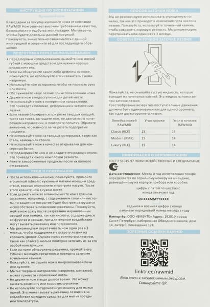 Руководство пользователя, вложенное в каждую коробочку с ножом, напечатано на плотной гладкой бумаге.