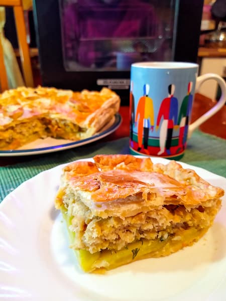 Пирог пропекся и сверху, и снизу, несмотря на сырую изначально начинку, и мы легко вынули его из корзины и переложили на тарелку. Начинка приготовилась и была ароматной и сочной.