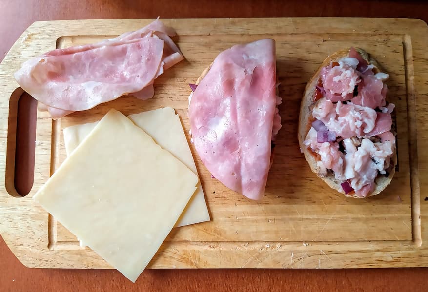 Мы включили RMA-02 в режиме «Тосты», и пока хлеб подсушивался на решетке, быстро порезали бекон, лук и пару шампиньонов. Подсушенный хлеб смазали томатным соусом, положили луково-беконно-грибную смесь, накрыли ветчиной и сыром и отправили все это дело обратно в печь в том же режиме.