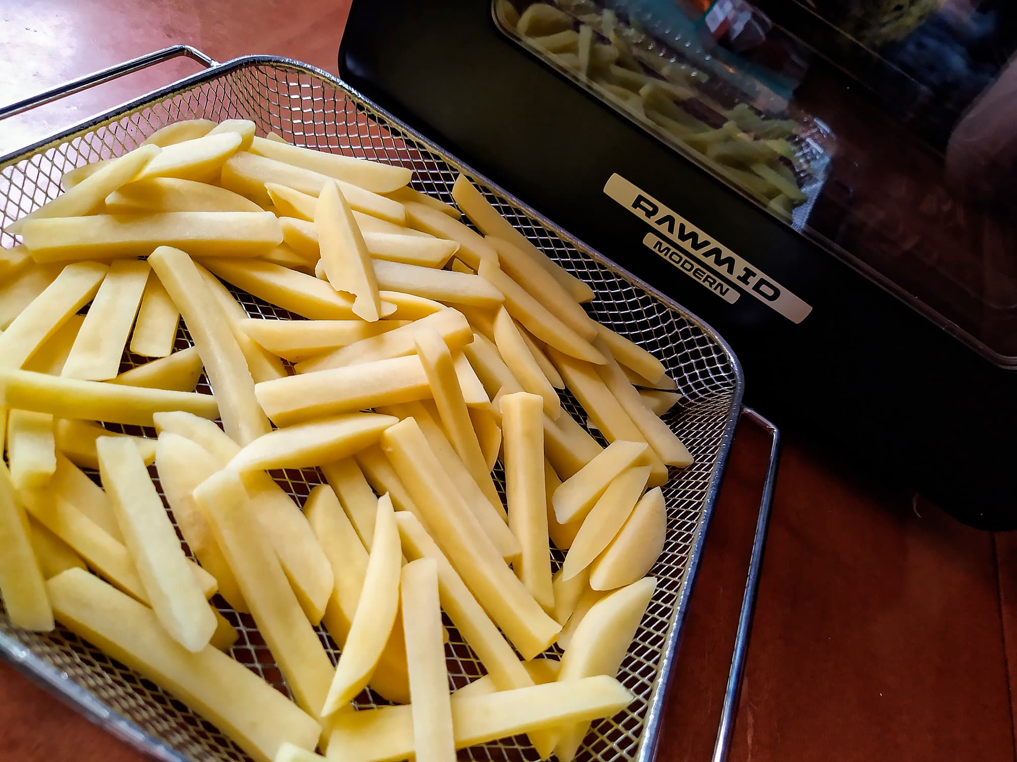 Идея этого теста лежит на поверхности, ведь мы имеем дело хоть и с аэро-, но фритюрницей. 300 г картофеля порезали брусками, замочили на полчаса в холодной воде, затем тщательно просушили и выложили в сетчатую корзину, сбрызнув маслом. Включили RMA-02 в режиме «Фри».