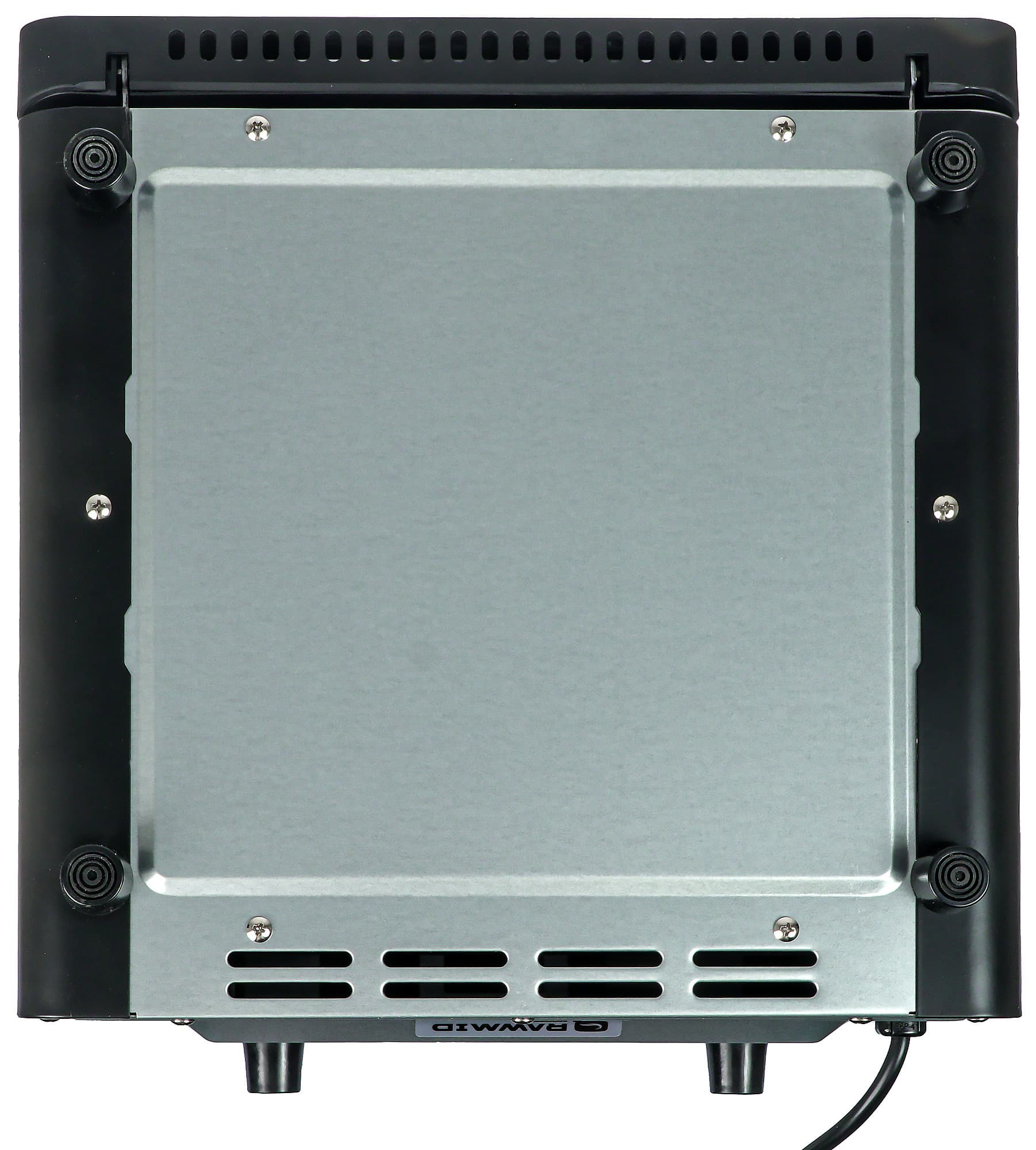 Вот только RMA-02 не придвинуть близко к стене, как микроволновую печь. Рекомендованное расстояние — 10 см, и этим указанием действительно нельзя пренебрегать: из воздухоотвода сзади дует горячий воздух, так что можно повредить поверхность, которая окажется на его пути. Вентиляционным отверстиям по бокам тоже нужно свободное пространство. Кстати, и верх печи заметно нагревается. Но небольшой размер и устройство прибора позволяют решить эту проблему: его можно хранить на лоджии, в шкафу, под столом, а при необходимости на этот самый стол водружать. Приготовил — убрал, с духовкой такой трюк не провернешь.