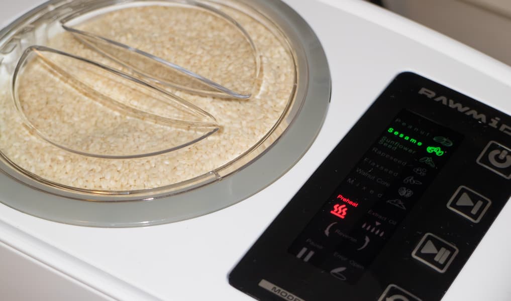 Перед отжимом все продукты, включая арахис, были подсушены в дегидраторе при 60 °C в течение двух часов. Все семена и орехи, за исключением тыквенных семечек и кедровых орешков, перерабатывались в предназначенном конкретно для данной культуры режиме. Указанные продукты были обработаны в режиме Mixed.
