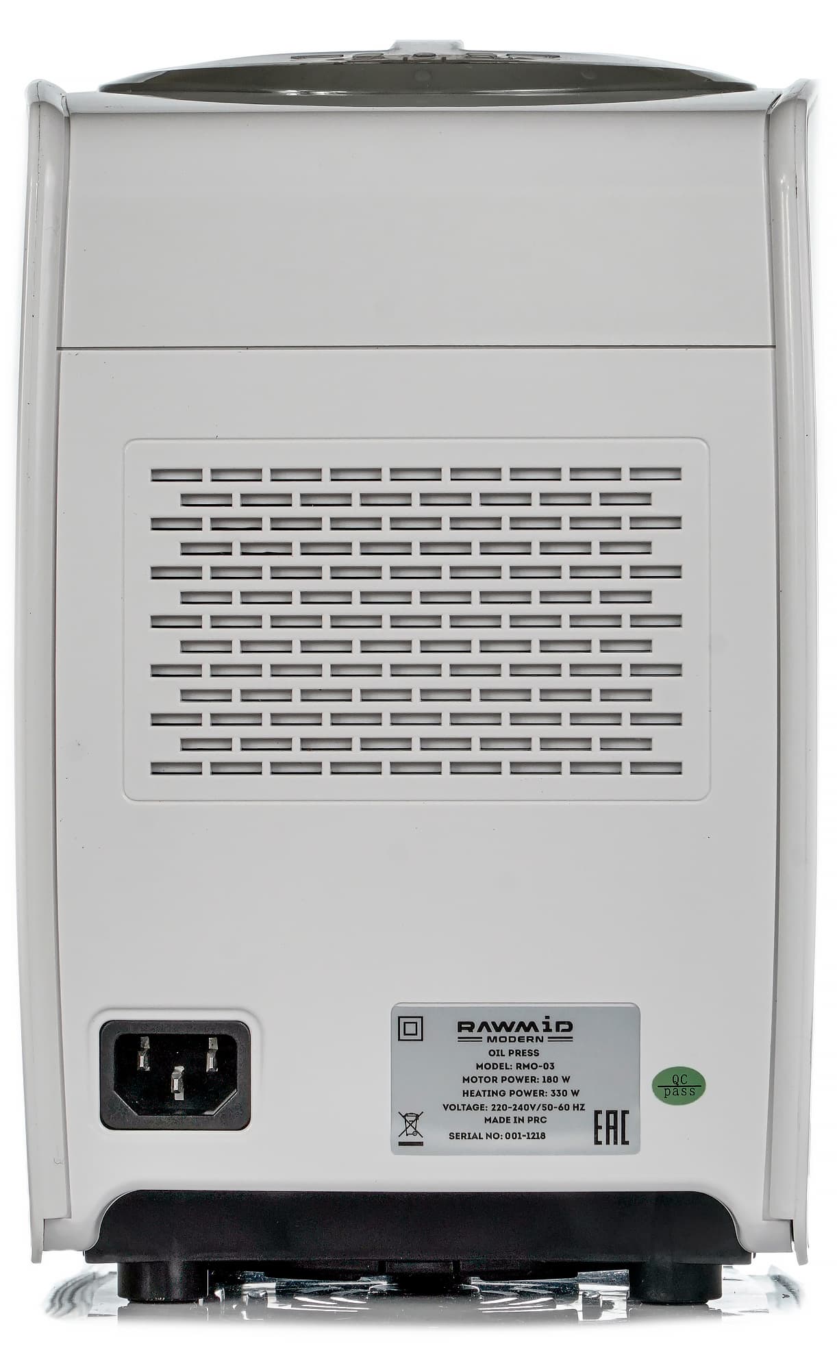 С левой стороны видны вентиляционные отверстия, разъем для сетевого шнура и наклейка с информацией о маслопрессе.