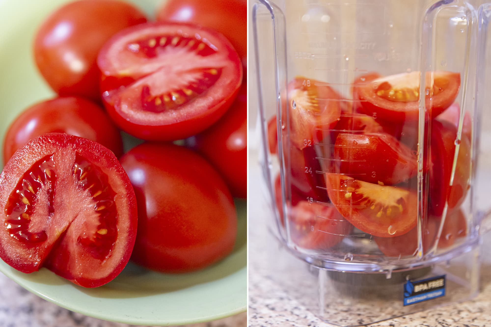 Для классического, обязательного теста мы отдали на растерзание блендеру 600 г томатов. Разрезали плоды на четвертинки и сложили в чашу. Воду не добавляли.