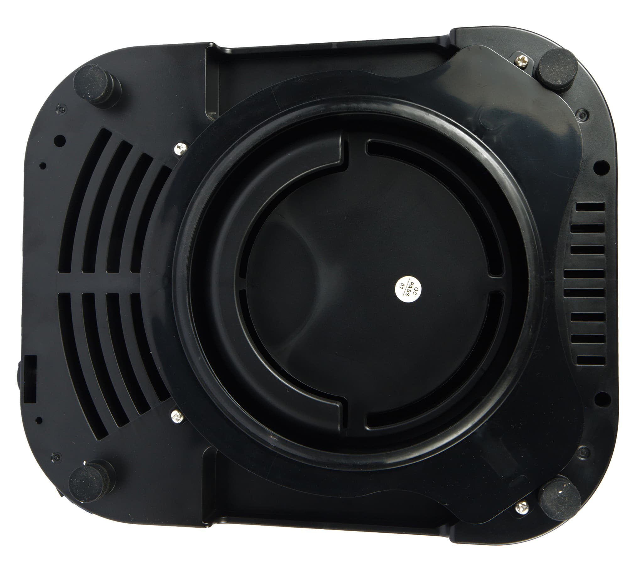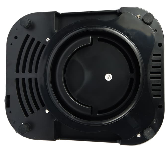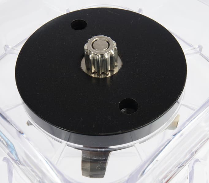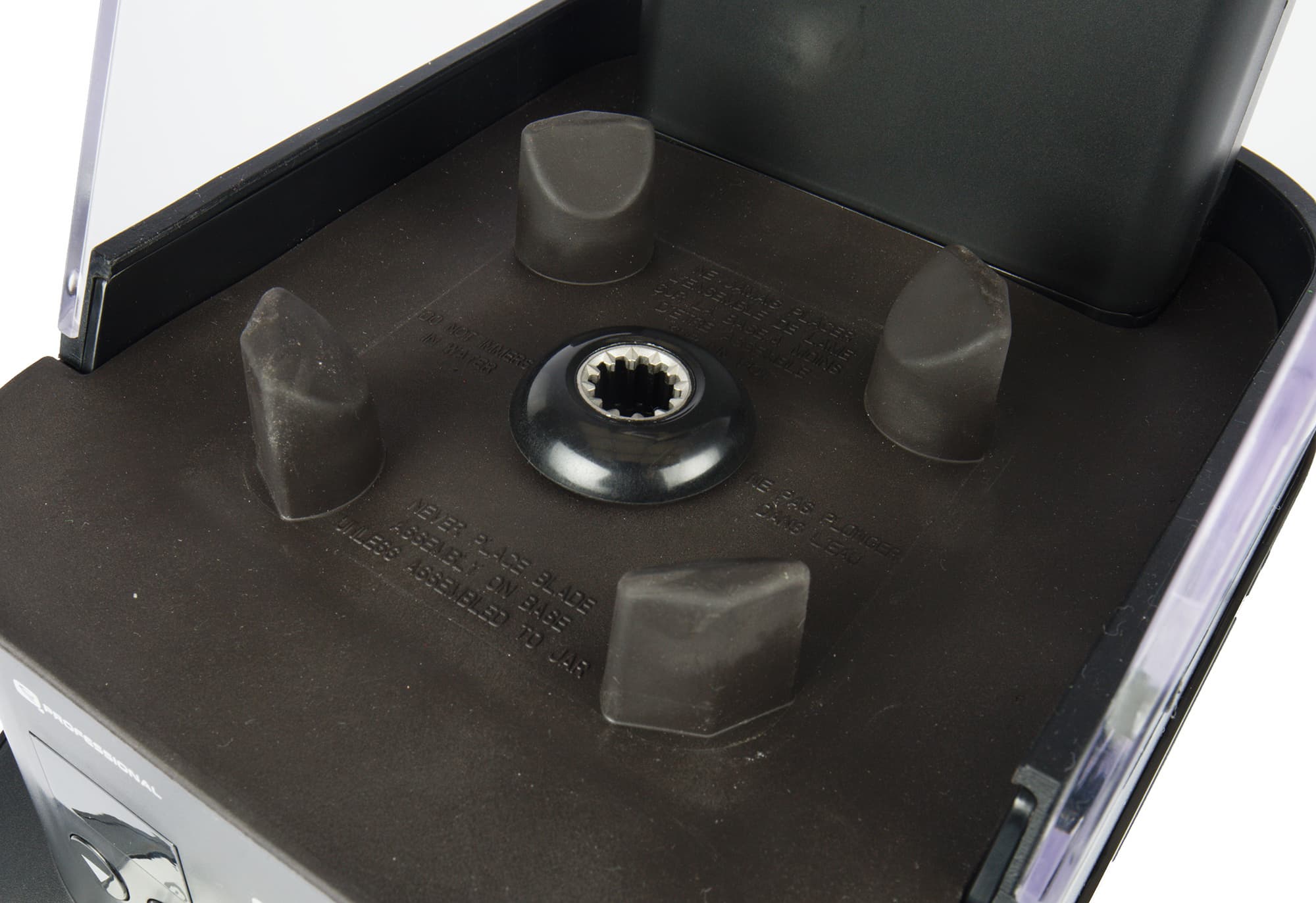 Внушительных размеров и немалого веса моторный блок из черного пластика стоит на небольших резиновых ножках, что позволяет конструкции устойчиво располагаться на поверхности и даже при сильном физическом воздействии не дает блендеру шанса упасть или хоть немного сдвинуться с места. На дне помимо ножек располагаются вентиляционные отверстия. В центре — специальный выступ для намотки шнура. Внизу по бокам конструкции есть две выемки под ладони для удобства переноски.