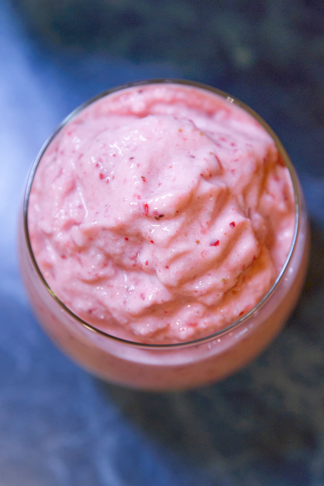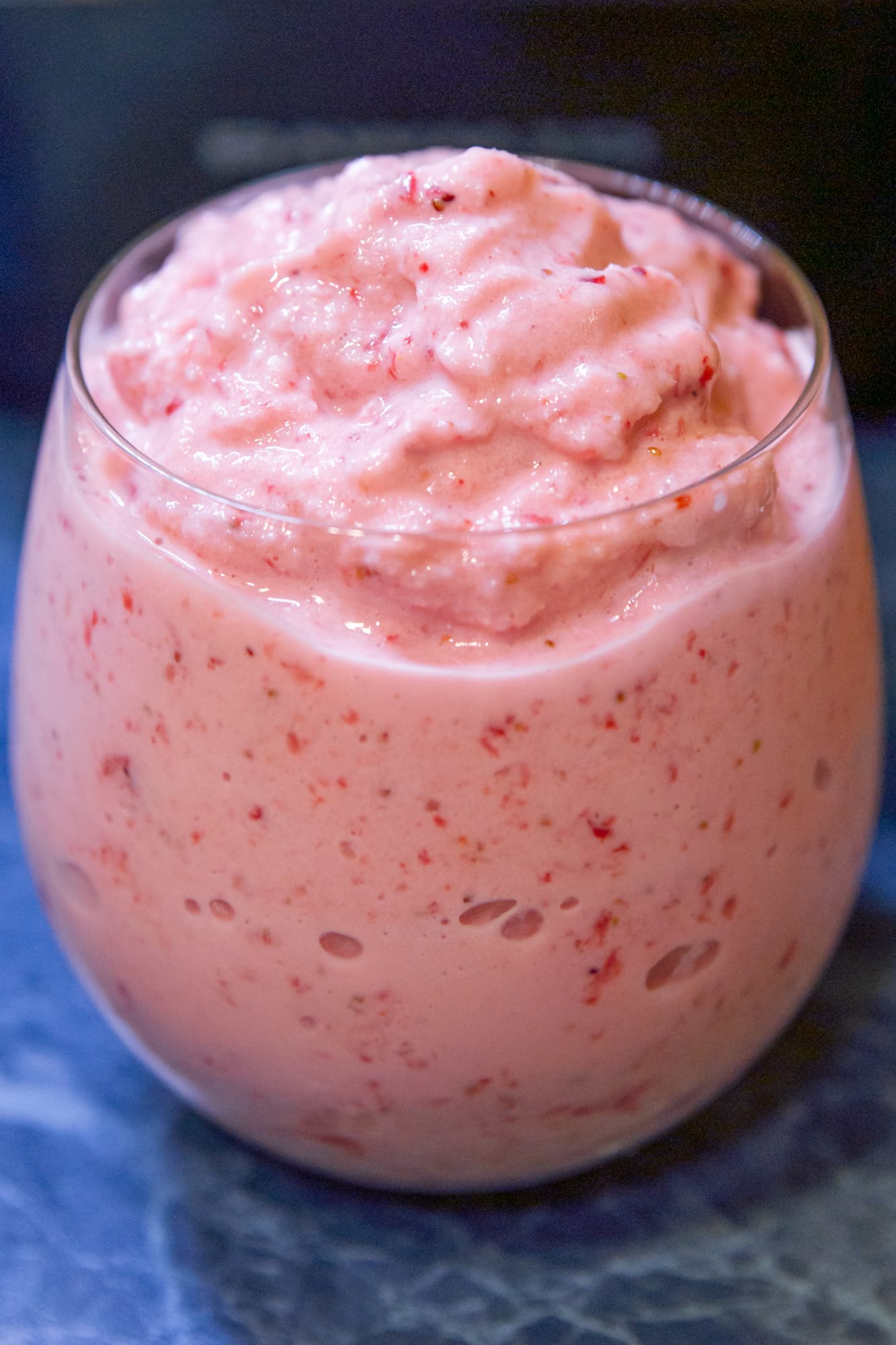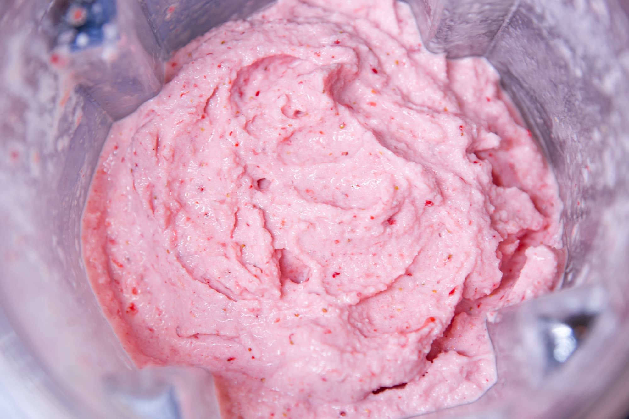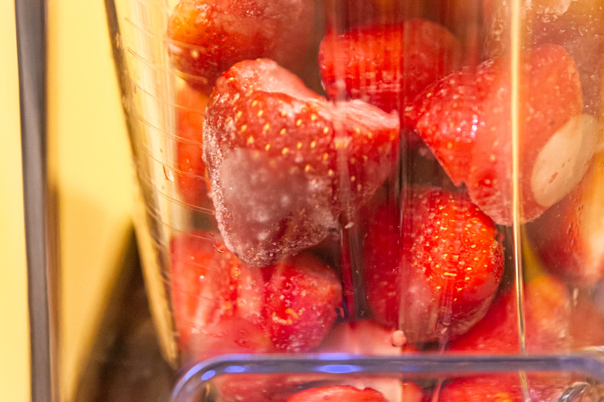 Измельчали в автоматическом режиме «Frozen» (Замороженные продукты). Процесс пошел неплохо, но через 20 секунд блендер забуксовал. Мы остановили мотор, достали кувшин и перемешали содержимое лопаткой. Вернули емкость на место и продолжили. Для того чтобы ягоды окончательно превратились в крошку, понадобилось еще 50 секунд и одно перемешивание. Учитывая, что мы превысили рекомендуемое количество загружаемых в кувшин продуктов — результат отличный! В измельченную клубнику добавили 150 мл сливок, немного сахарной пудры и еще раз запустили блендер на 20 секунд.
