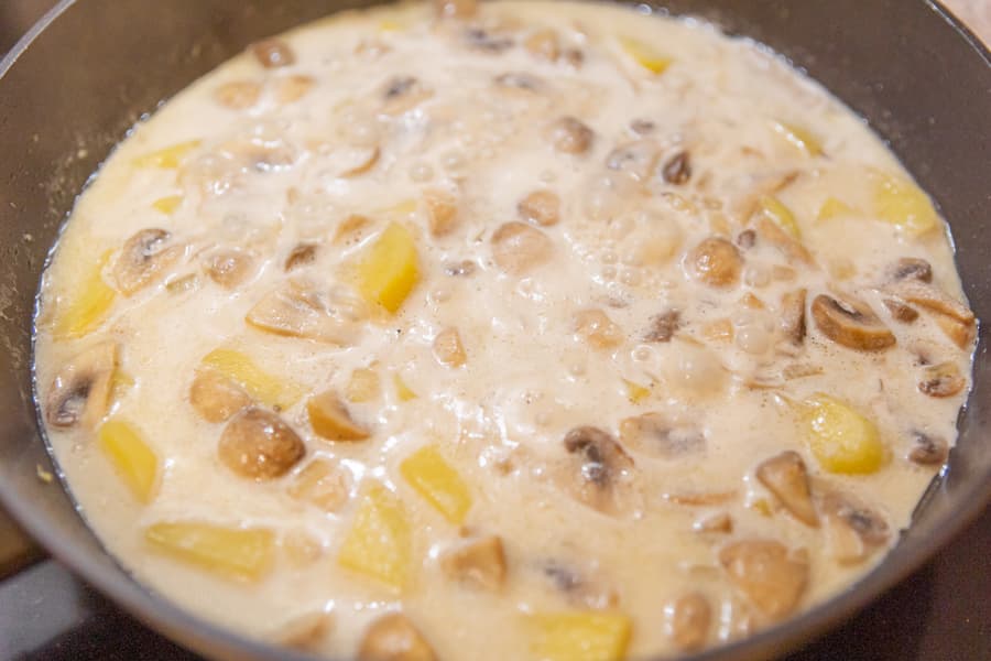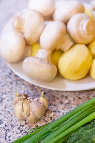Ингредиенты: шампиньоны — 250 г, сливки — 3 ст. л., 250 мл куриного бульона, картофель — 2-3 шт., лук репчатый — 1 шт., 3 зубчика чеснока, сливочное масло для жарки, соль и специи по вкусу