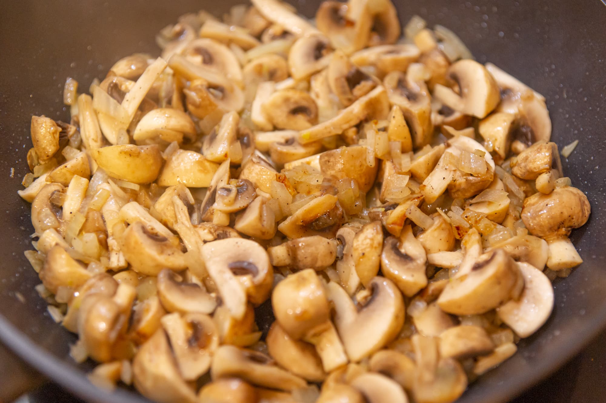 Мелко порубленный репчатый лук вместе с шампиньонами отправился в глубокую сковородку.
