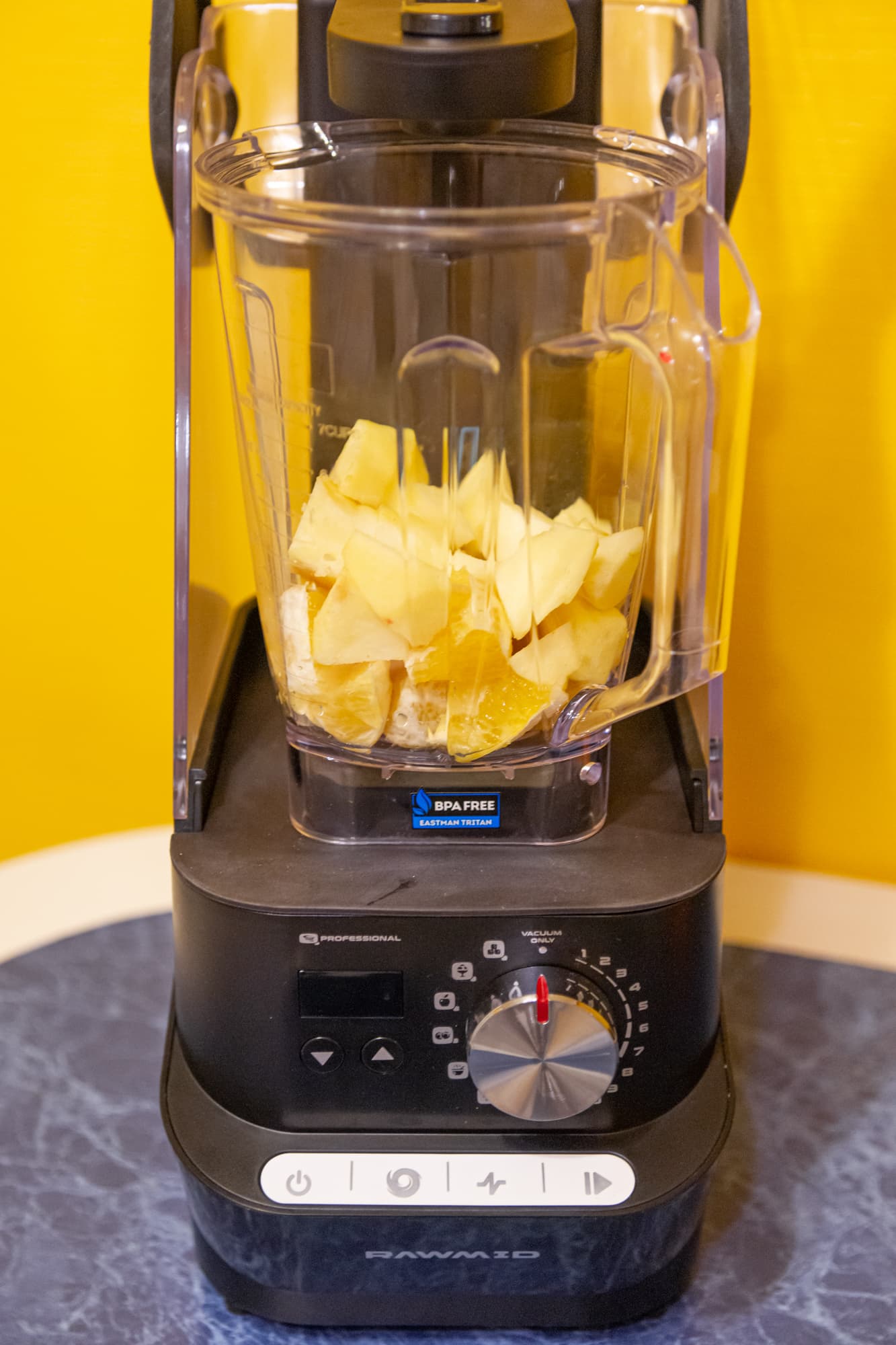Загрузили крупно нарезанные фрукты в чашу блендера до максимальной отметки в 1,5 л и запустили мотор в ручном режиме. Сначала на 5-й скорости, затем в середине процесса (секунд через 15) плавно увеличили до 8-й. Вакуумирование включили, потому как без него нам теперь недостаточно вкусно и однородно.