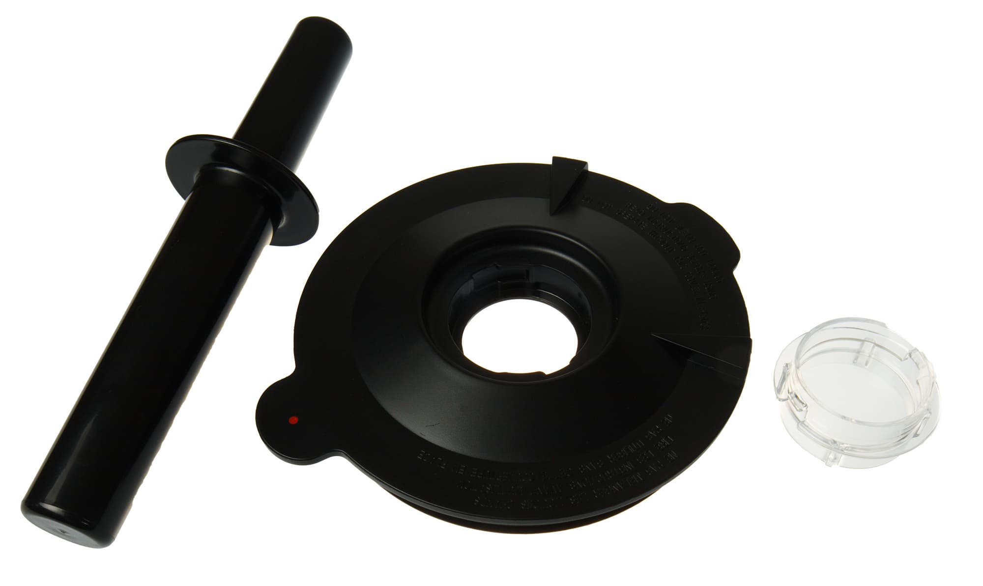 Отверстие в центре первой крышки закрывается заглушкой. При необходимости использования толкателя ее можно снять. Толкатель из черного пластика классической формы имеет ограничитель в верхней части, что при использовании вместе с крышкой не позволяет ему опуститься ниже дозволенного и попасть под ножи.