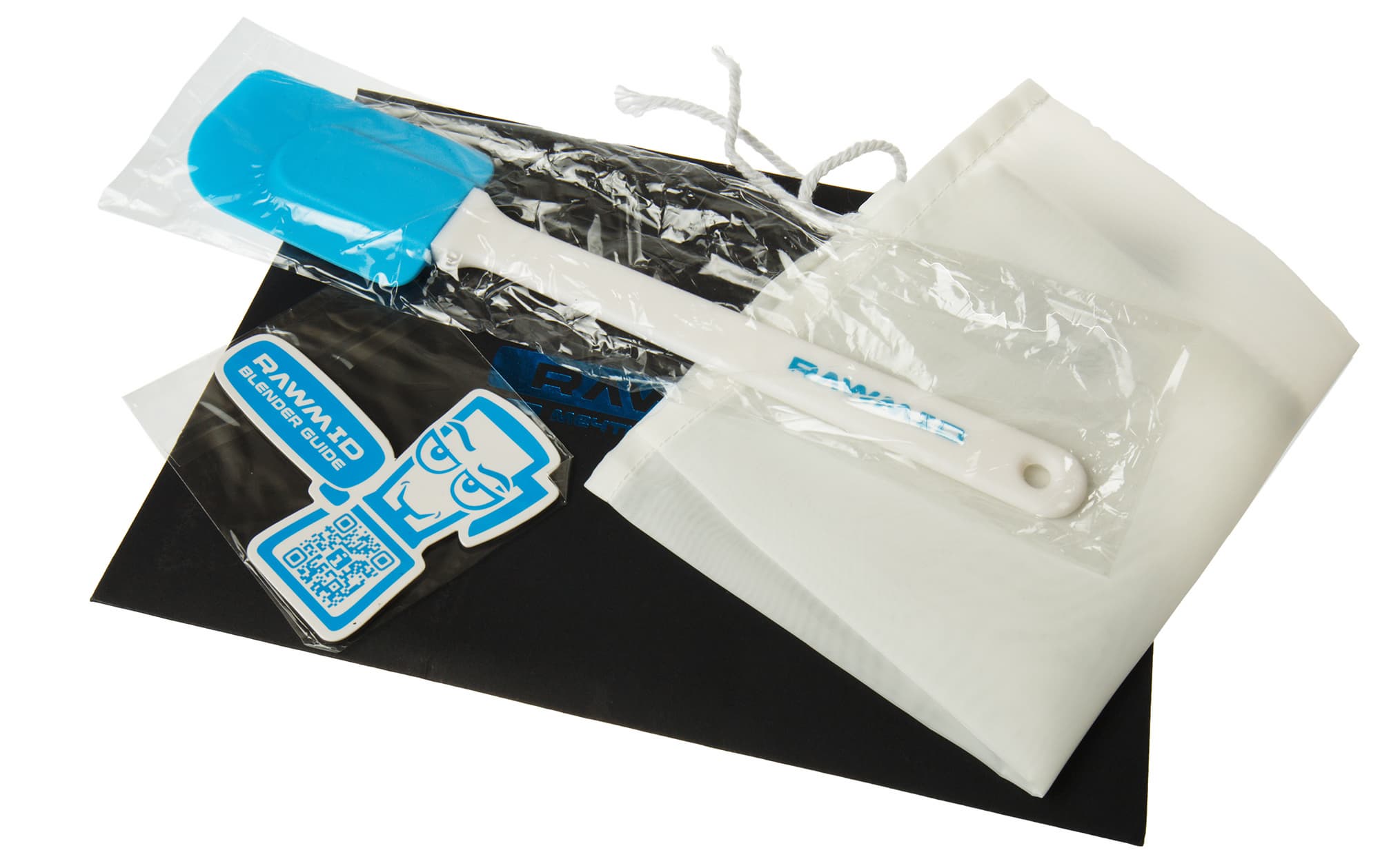 Помимо аксессуаров, входящих в стандартную комплектацию, мы получили силиконовую лопатку, мешочек для орехового молока, магнитик с гайдом, направляющий на официальную страницу блендера на сайте компании, и термонаклейку для кувшина.