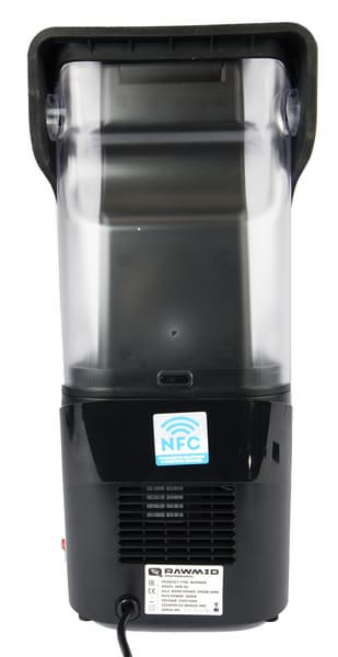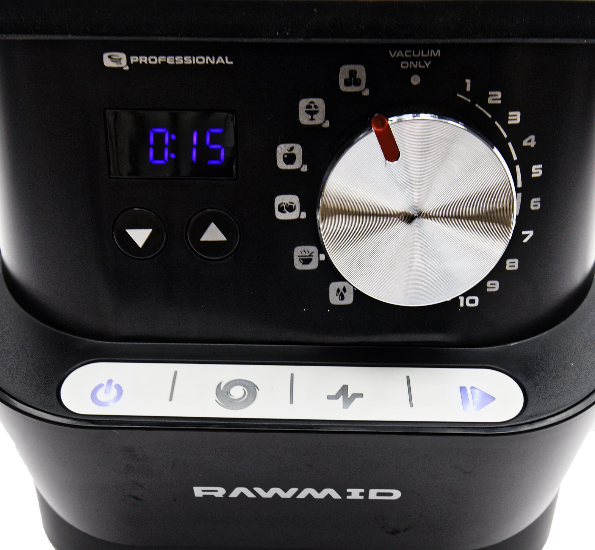 Панель электронно-ручного управления Rawmid Pro RPB-04 расположена на фронтальной стороне моторного блока. В нижней части находятся кнопки питания, импульсного режима, запуска и отключения вакуумирования, а также запуска и остановки мотора. Над ними, в левой части — кнопки настройки таймера и дисплей, на котором отображается его значение, справа — круглый переключатель скоростей и автоматических режимов.
