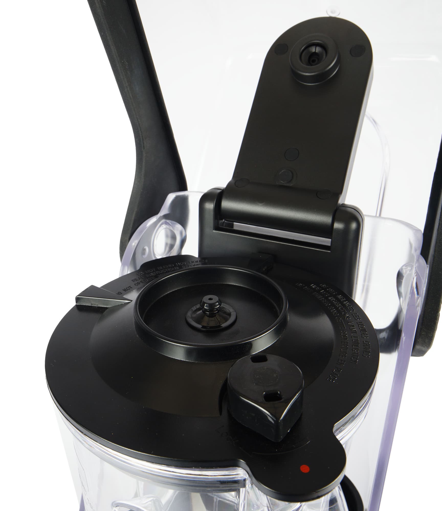 Съемный антишумовой колпак из прозрачного пластика с большой удобной ручкой плавно открывается более чем на 90°. В открытом положении он не мешает извлекать кувшин или использовать толкатель при измельчении продуктов. Места соприкосновения колпака с корпусом блендера уплотнены резиной.