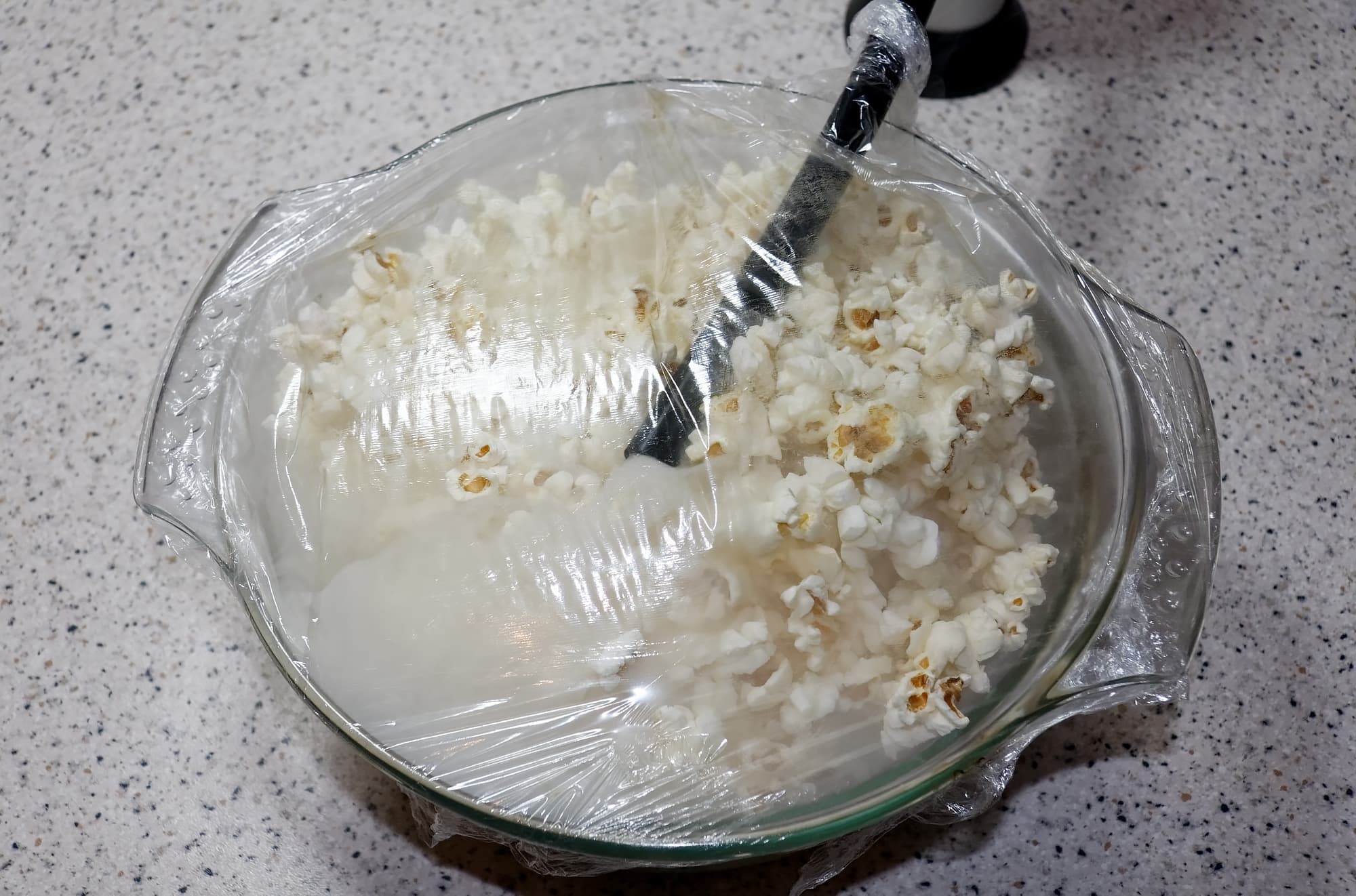 Попкорн со вкусом дыма — почему бы нет? Процесс отработан: кладем попкорн в емкость, накрываем пленкой, запускаем дым.