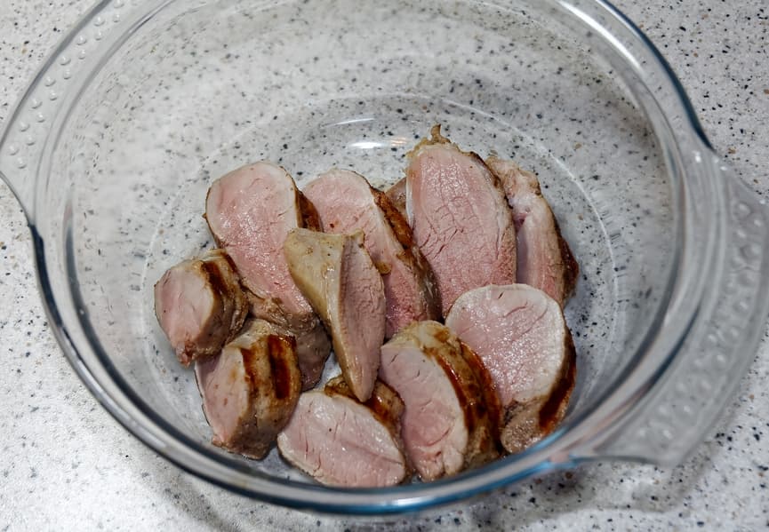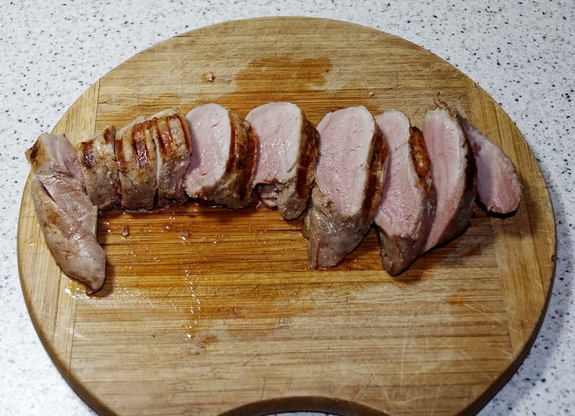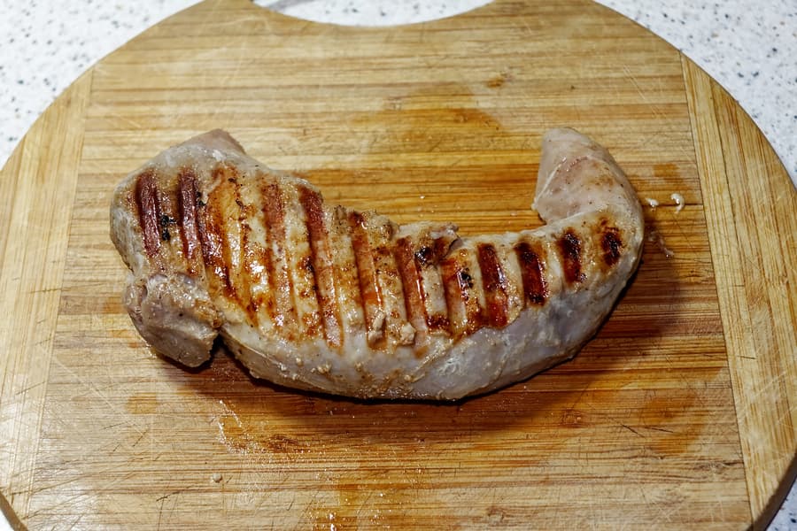 Готовая вырезка была извлечена из пакета, обжарена на гриле и нарезана.
