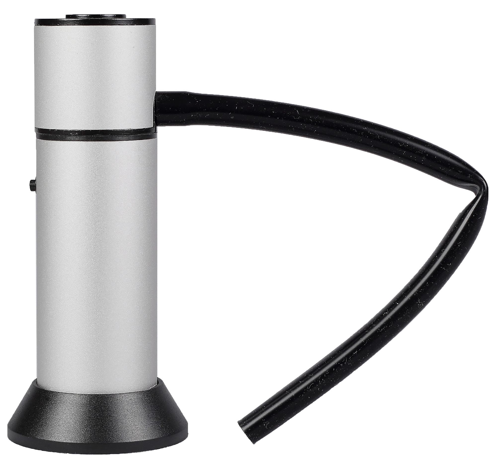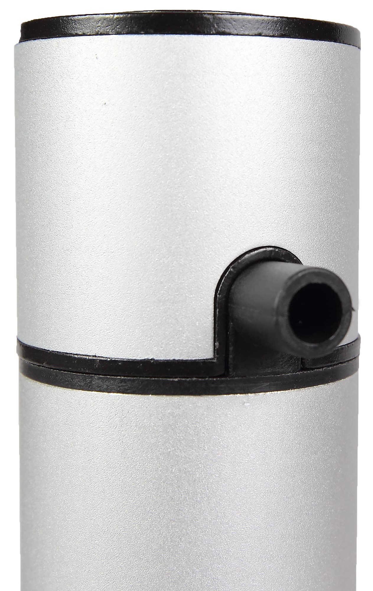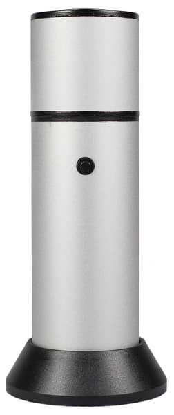 Наш дымогенератор имеет вертикальный дизайн: в рабочем положении он стоит на столе. Основание корпуса — черный матовый пластик. Верхняя часть, которая имеет контакт с огнём, выполнена из стали. Корпус прибора покрыт матовым металлическим листом, окрашенным в серебряный металлик.