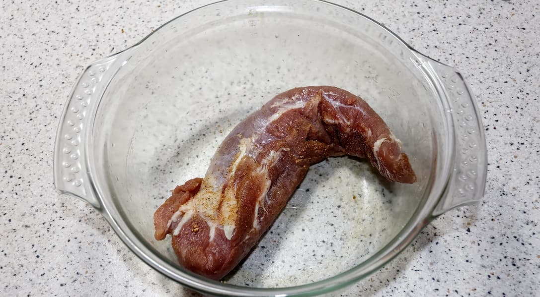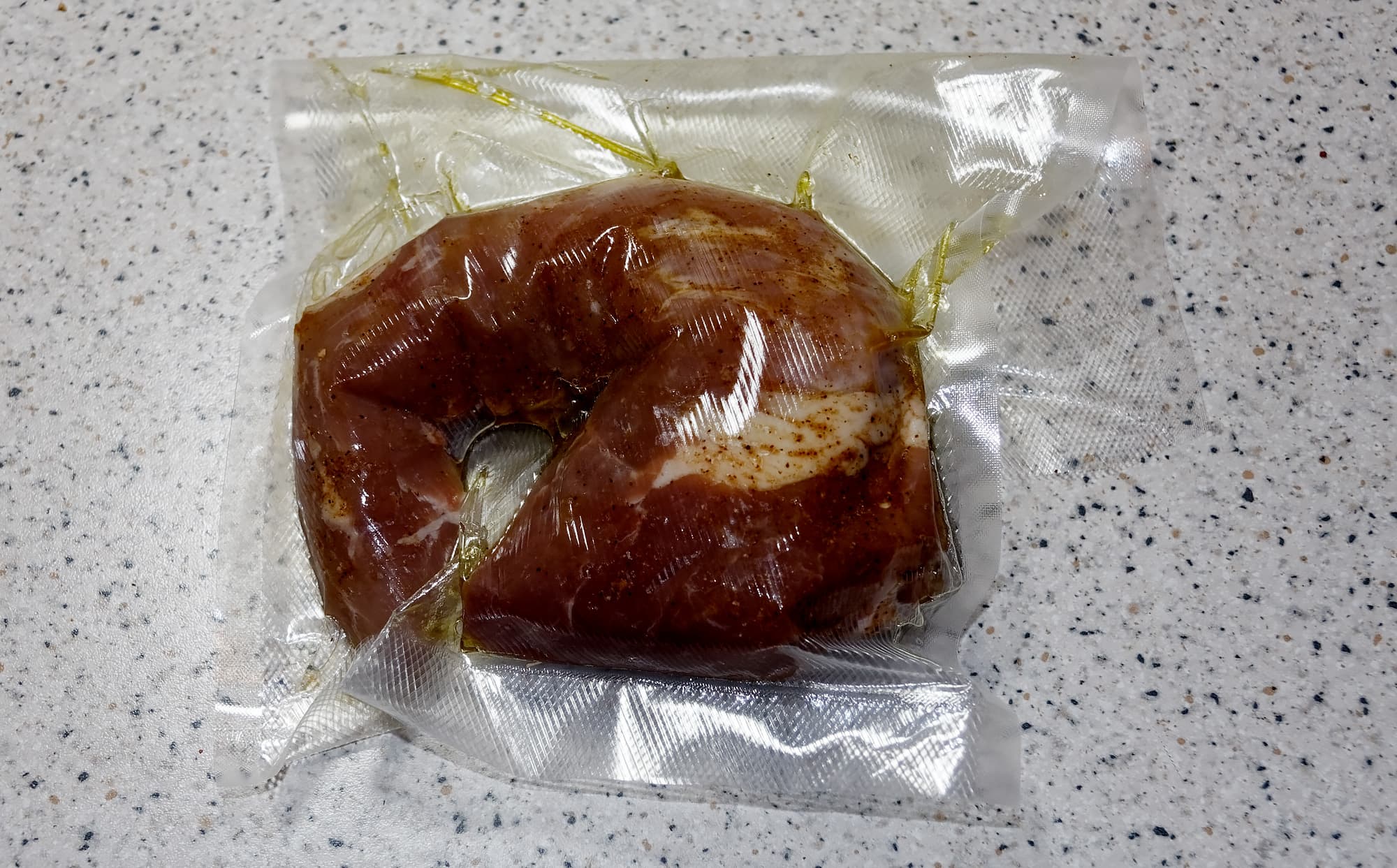 Вырезка была окурена (на прозрачном стекле можно увидеть следы от осевшего дыма), приправлена специями, вакуумирована и отправлена в воду, предварительно разогретую до 59 градусов, на два часа.