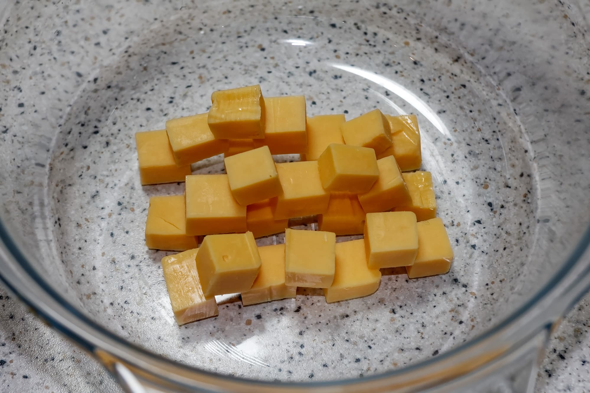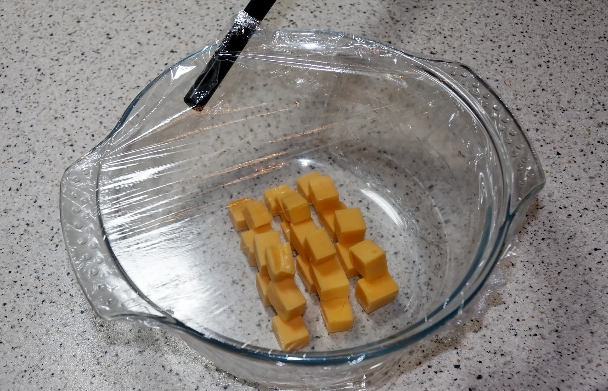 Сыр нарезали на кубики, поместили в кулинарную емкость и накрыли пищевой пленкой.