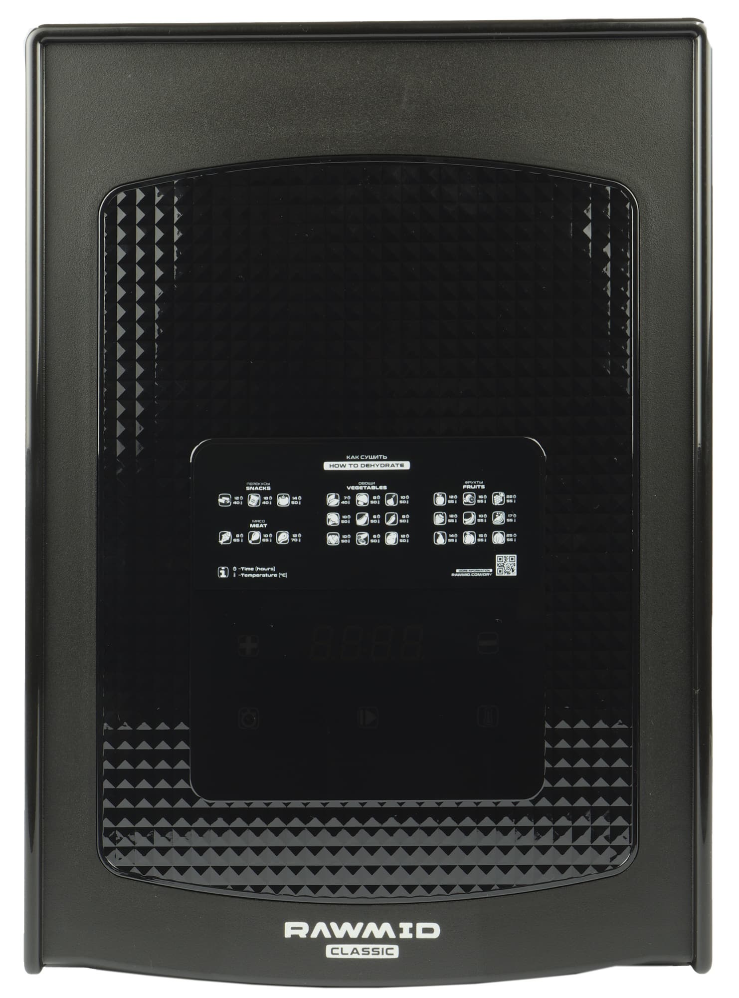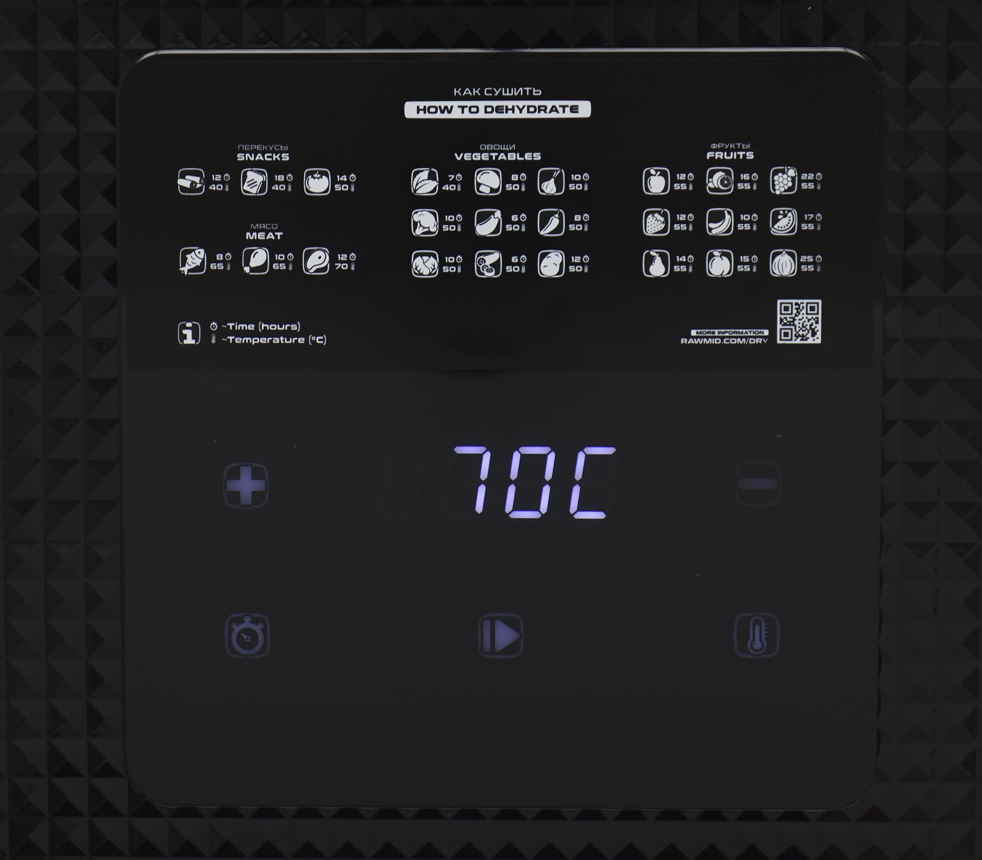 Сенсорная панель управления встроена в верхнюю часть корпуса. Выше области где находятся сами кнопки есть наклейка-памятка с рекомендациями по выбору параметров и QR-код, ведущий на страницу официального сайта Rawmid с подробным руководством по сушке различных продуктов.
