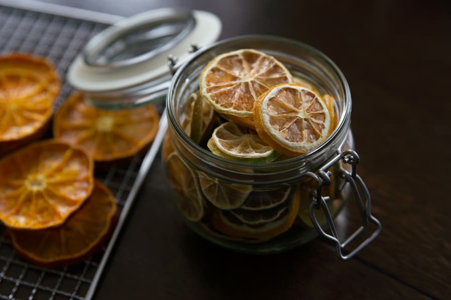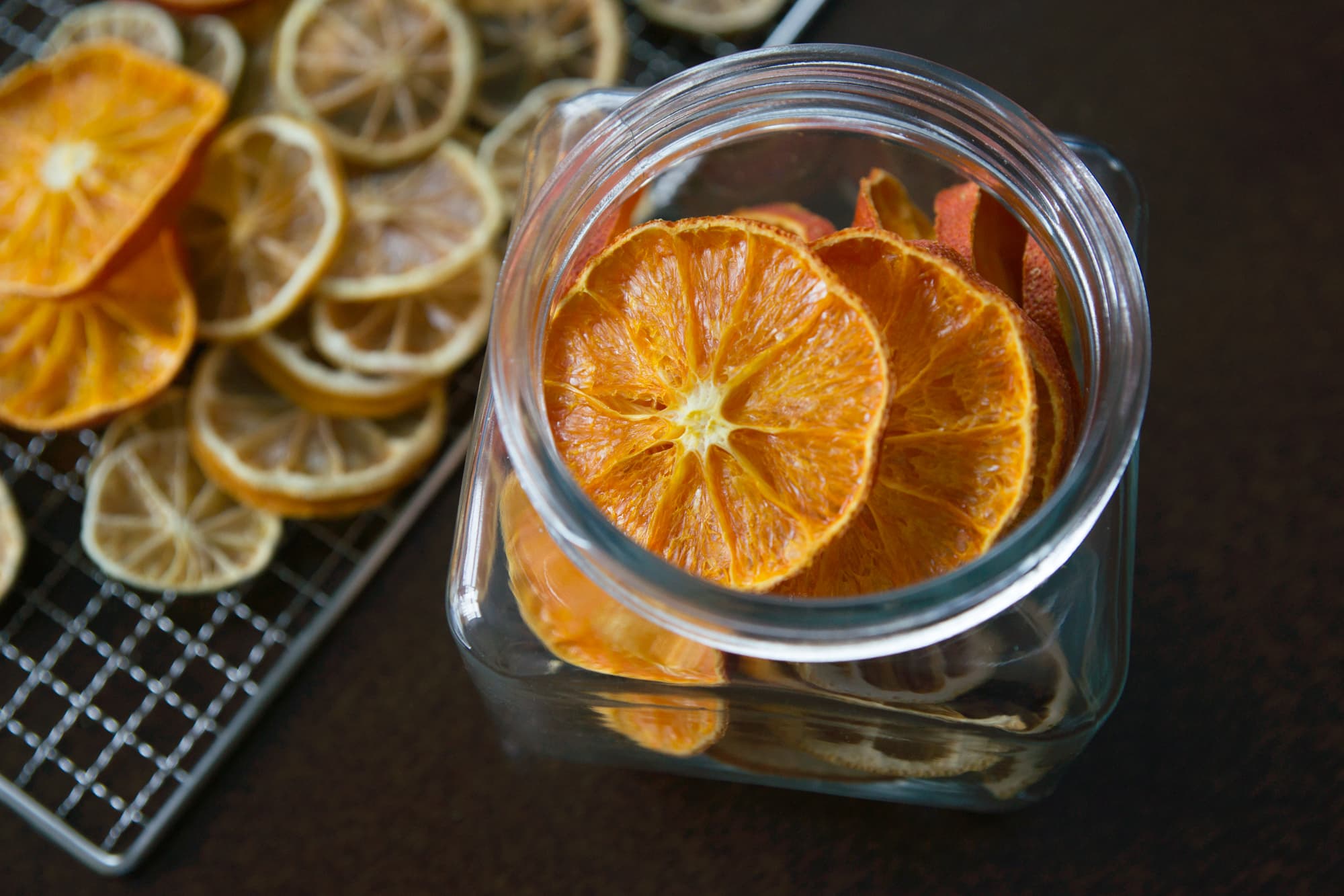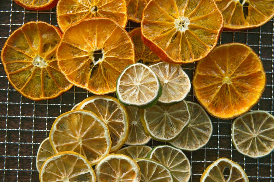 Тонко нарезанные сочные мандарины, лаймы и лимоны уложили на металлические сетчатые уровни и отправили сушиться при 65 °C.