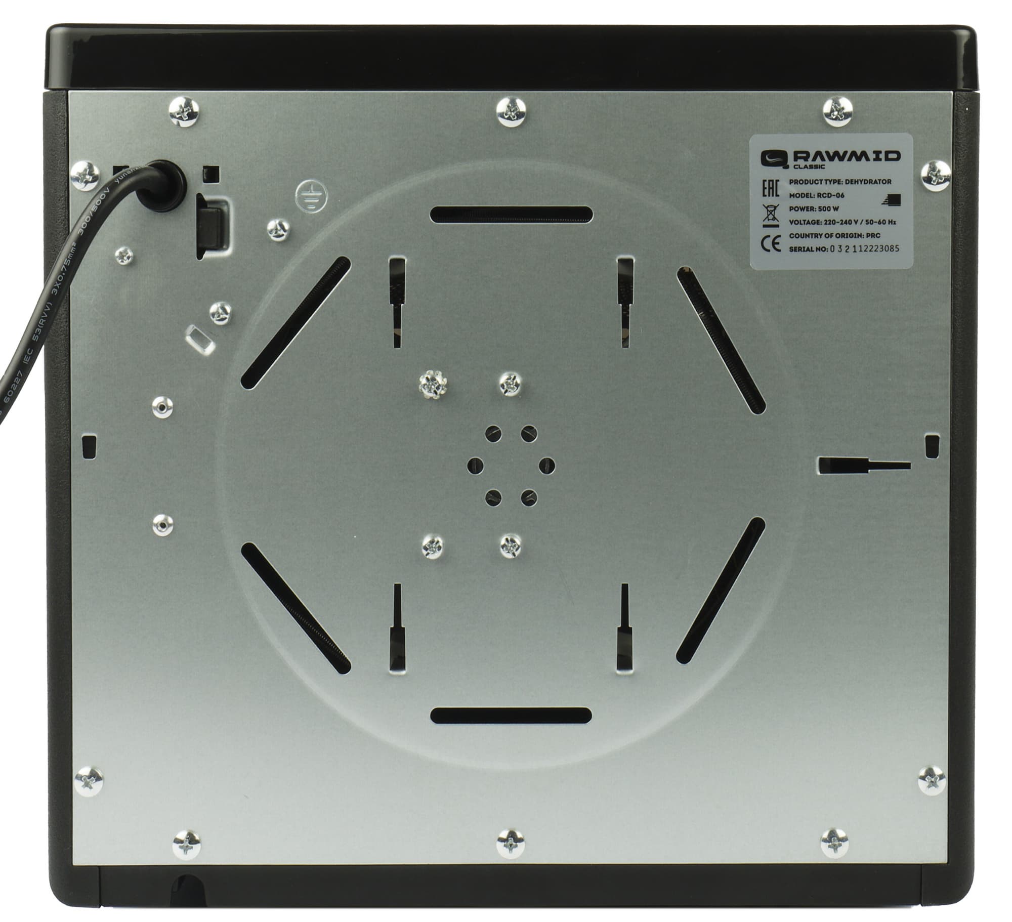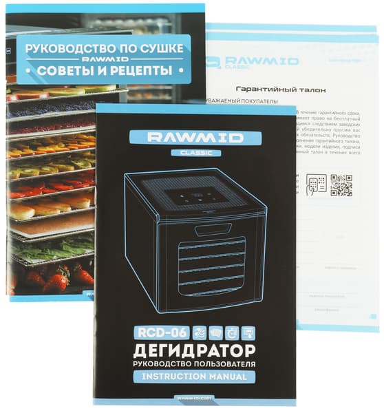 Rawmid Classic RCD-06 — это шестиуровневый дегидратор мощностью 500 Вт, предназначенный для сушки овощей, фруктов, мяса и зелени. Как мы узнали из комплектного руководства по сушке, кроме классического использования в устройстве можно делать расстойку дрожжевого теста, готовить пастилу, йогурт и даже сыр — диапазон нагрева воздуха позволяет. Корпус прибора двухслойный, так что мы ждем особенно эффективной сушки и пониженного уровня шума.