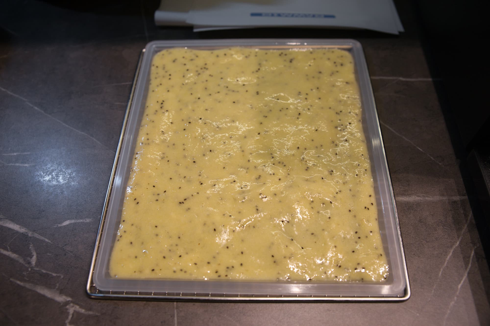 На одном из уровней разместили будущую пастилу. Пластиковый лоток с бортиками смазали небольшим количеством растительного масла, затем ровным слоем выложили на него измельченное блендером пюре из бананов и киви весом около 500 г.
