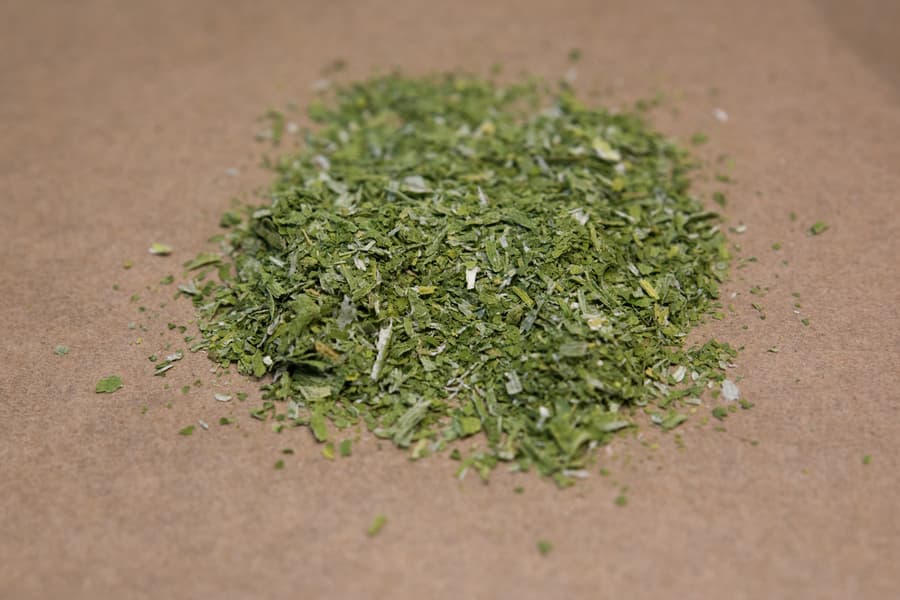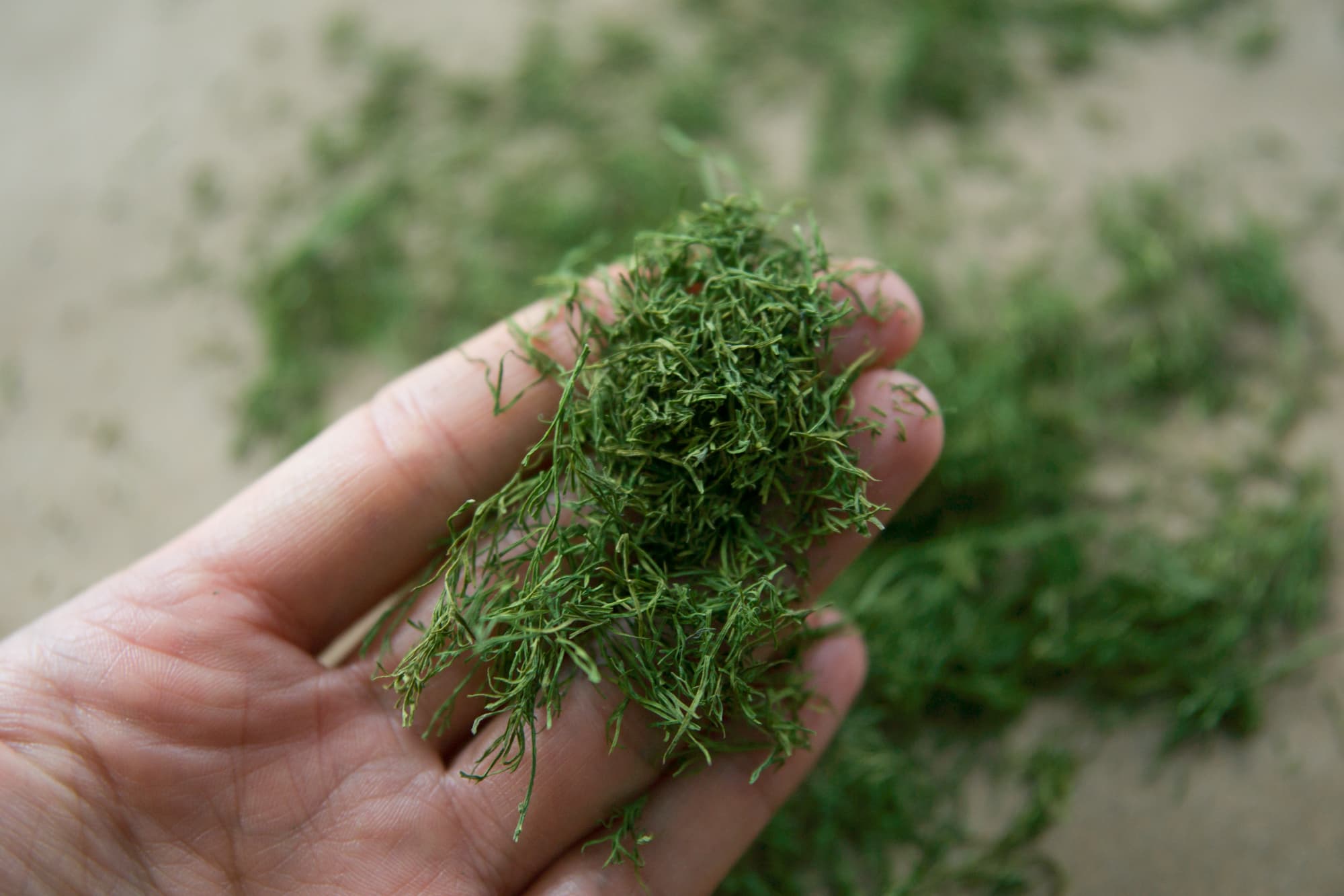 Быстрее всех высушился укроп: его мы сняли с сетки через 11 часов. Зелень не пожелтела, полностью лишилась влаги и легко крошилась при перетирании пальцами.