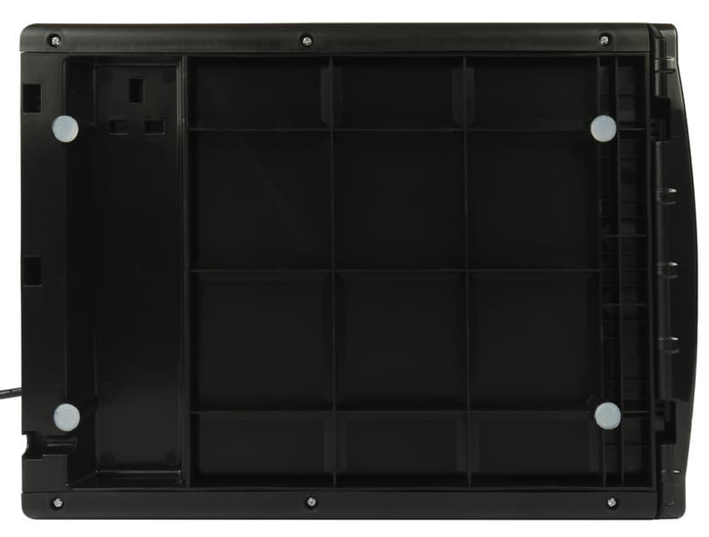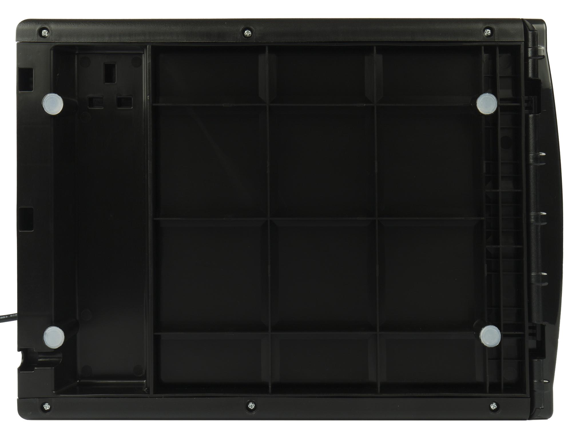 На задней стенке расположены шурупы крепежа мотора вентилятора, вентиляционные отверстия, шильдик с технической информацией о приборе. Вверху выходит шнур электропитания длиной 115 см.